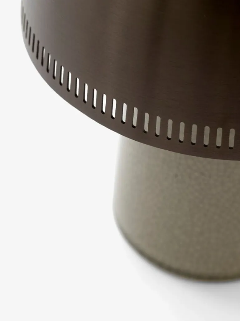 &Traditions Raku SH8 är en bärbar bordslampa som både har inspirerats och fått sitt namn av en traditionell japansk krukmakeriteknik. Bordslampan Raku, som har formgivits av Sebastian Herkner, består av två kontrasterande element: en stor fot i keramik och en tunn skärm i metall med perforerad kant. Foten är dekorerad med krackelyr som blir än mer framträdande när lampan är tänd. Keramikfoten tillverkas för hand, vilket gör att krackeleringsmönstret blir helt unikt.