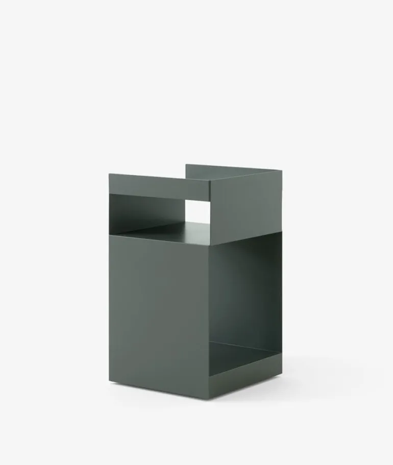 Sidobordet Rotate från &Tradition kombinerar en ren, geometrisk form med multifunktionella stålfack. Rotate sidobordet är designat av Space Copenhagen och är konstruerat av två tunna metallplåtar som har böjts och svetsats samman, vilket resulterar i ett större och ett mindre förvaringsfack samt en bordsskiva med kanter.