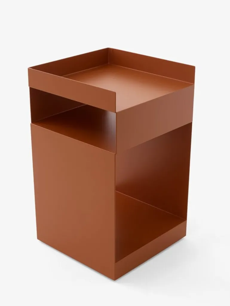 Sidobordet Rotate från &Tradition kombinerar en ren, geometrisk form med multifunktionella stålfack. Rotate-sidobordet, som är designat av Space Copenhagen, är konstruerat av två tunna metallplåtar som har böjts och svetsats samman, vilket resulterar i ett större och ett mindre förvaringsfack samt en bordsskiva med kanter.