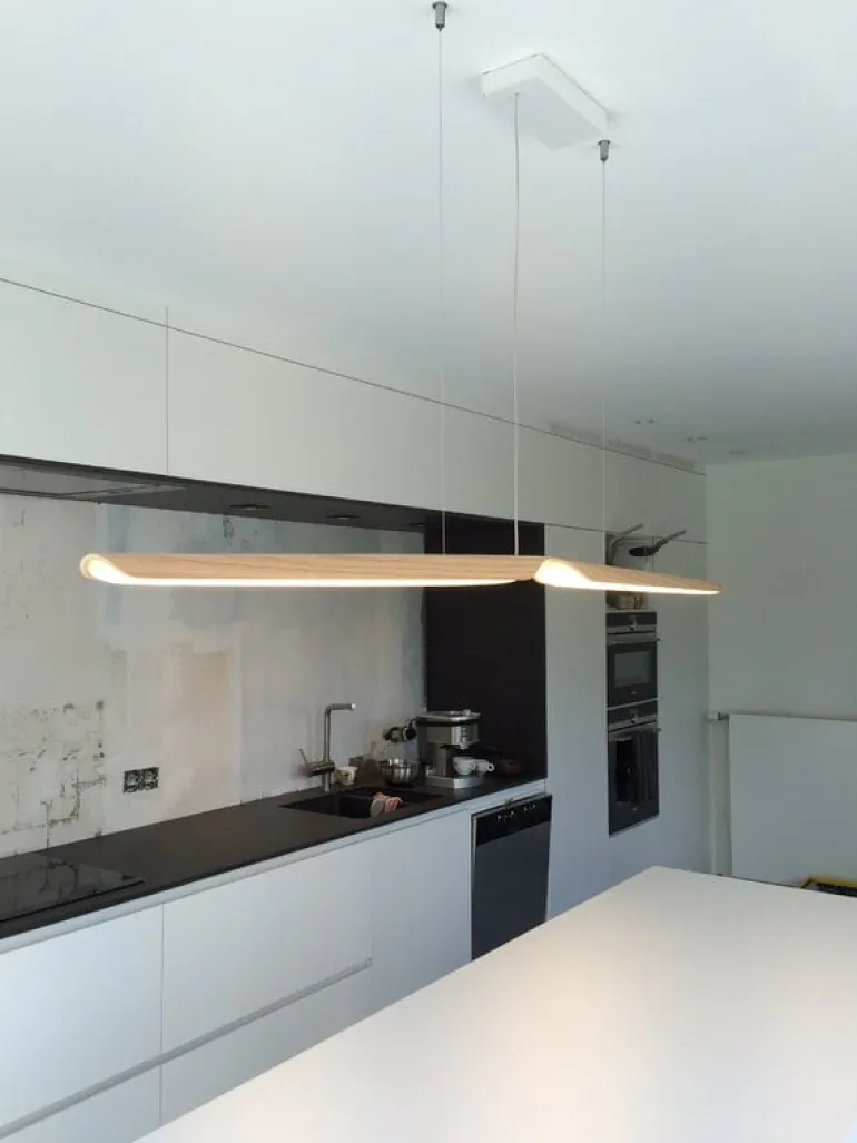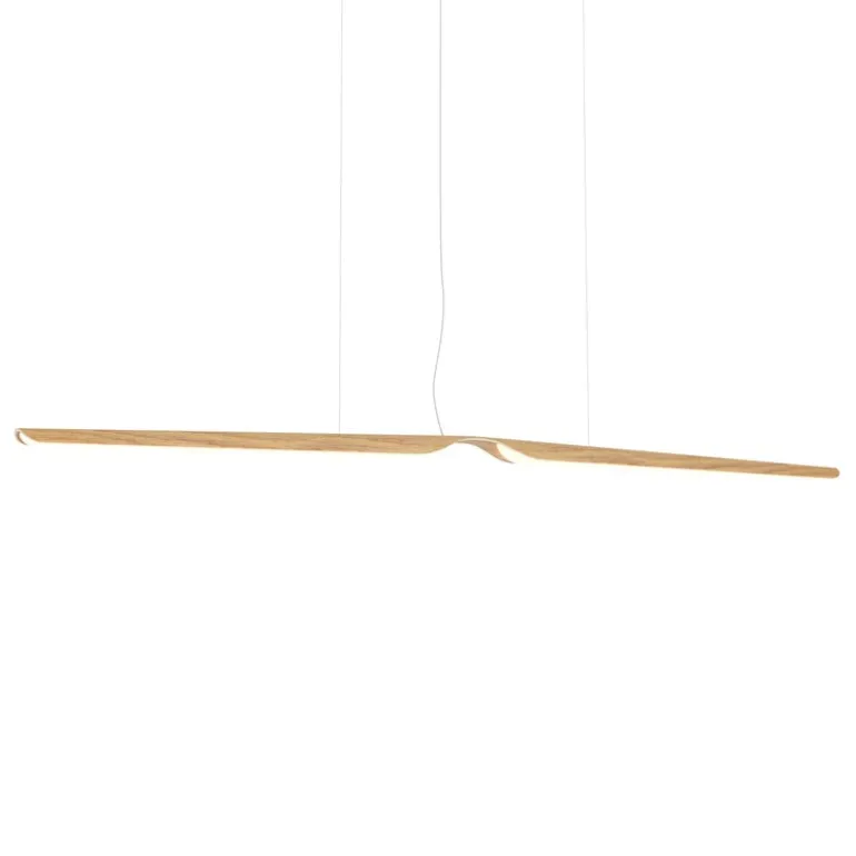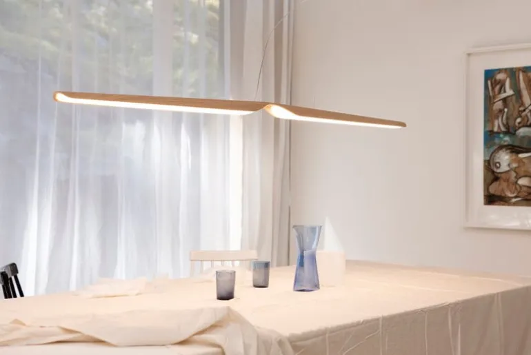 När Kärkkäinen designade Swan var ambitionen att forma ett attraktivt föremål med en viss plasticitet och skulptural karaktär – för att skapa en kontrast mellan material och form. Swan görs i Finland och skärmen är tillverkad av böjd ek-plywood, med en tydlig krökning på mitten som får lampan att likna en svan som sprider ut sina vingar. Pendellampan ger ett mycket luftigt intryck som förstärks av det dimbara ljuset som strålar ut från mitten av den böjda träskivan.