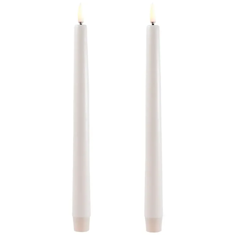 De avsmalnande LED-ljusen från Uyuni Lighting är ett säkert sätt att skapa en varm och inbjudande atmosfär i ditt hem – en sådan som endast det mjukt flimrande ljuset från tända ljus kan skapa. LED-ljusen är övertygande autentiska. De är belagda med äkta stearin och utrustade med Uyunis patenterade 3D-låga som imiterar den fladdrande lågan på ett vanligt ljus, och lyser mjukt med ett varmt och vitt sken.