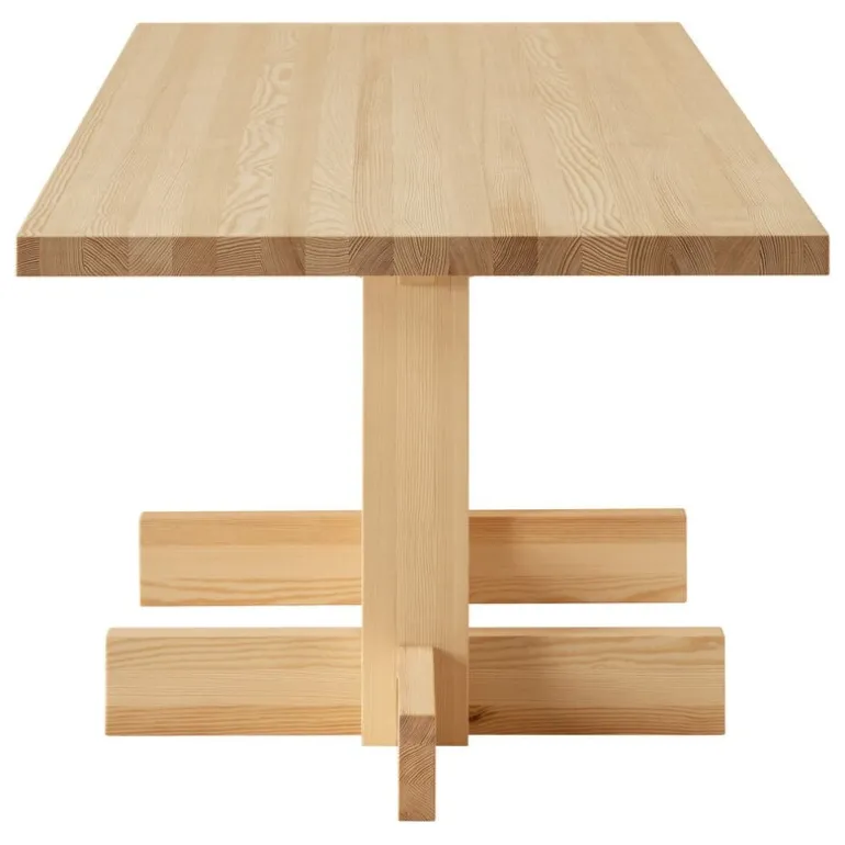Vaarniis fyrkantiga matbord, som designats av Fredrik Paulsen, är en djärv möbel, vars förminskade form gör att materialet får stå i centrum: Finsk furu. Enligt designern har furuns naturliga ådror nästan ett ”psykedeliskt” mönster, och det ser bättre ut på större ytor. Alla bord har ett unikt ådrat mönster tack vare materialets naturliga variation.
