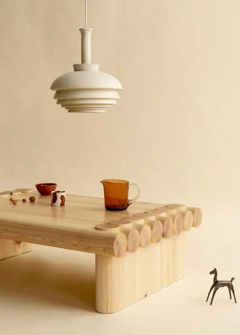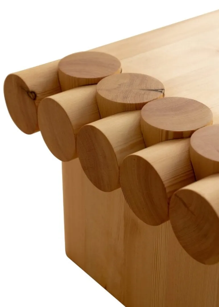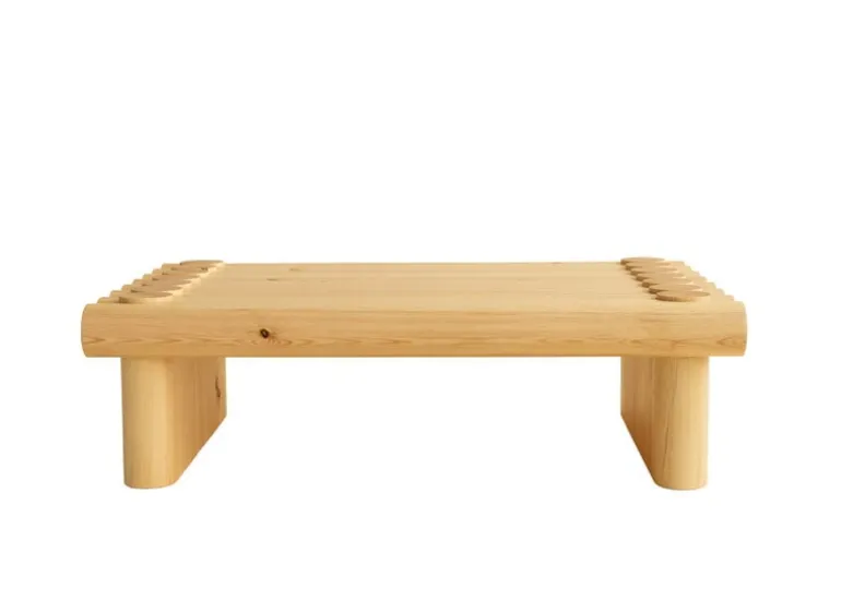 Vaarniis soffbord i furu fångar ögat tack vare de överdrivna proportionerna eller det ovanliga valet av snickeri. Designen är skapad av Soft Baroque och påminner om det traditionella snickeriet som ofta används i finska trästugor för att skapa en konstruktion som också är enormt hållbar och stark: soffbordet är starkt nog för att sitta, stå eller dansa på.