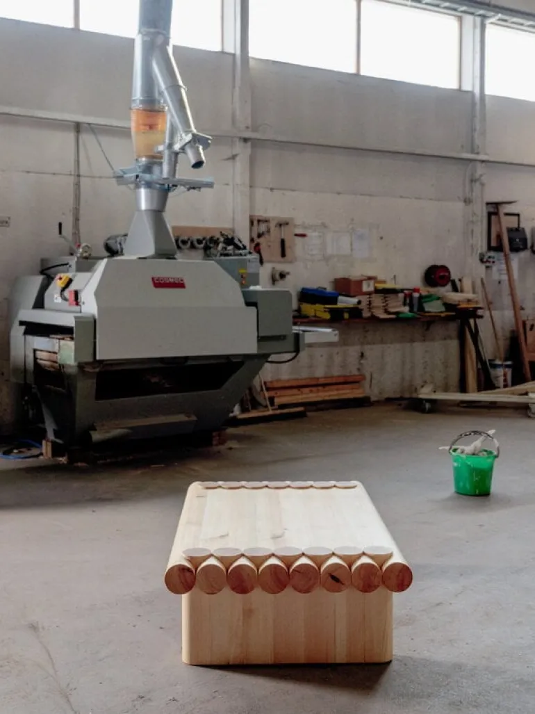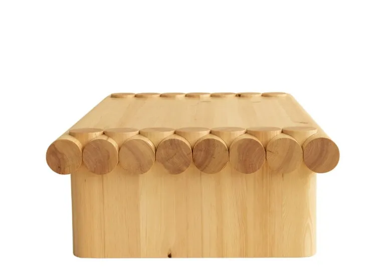Soffbordet är tillverkat av finsk, ej odlad furu, ett ofta förbisett material med exceptionell karaktär. Dessutom gör de livliga ådrorna och knutarna varje bord unikt. Träet får sin karaktär av oljor och harts som reagerar med UV-strålar och sakta gör att bordet får en intensiv, honungsliknande nyans. Därför blir bordet bara mer fascinerande ju mer det åldras och används, eller dansas på.