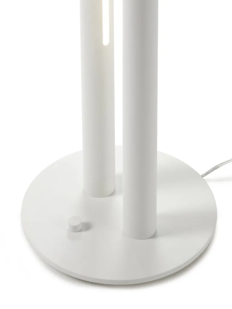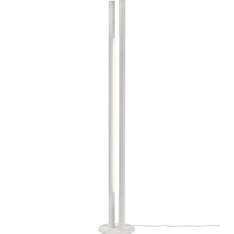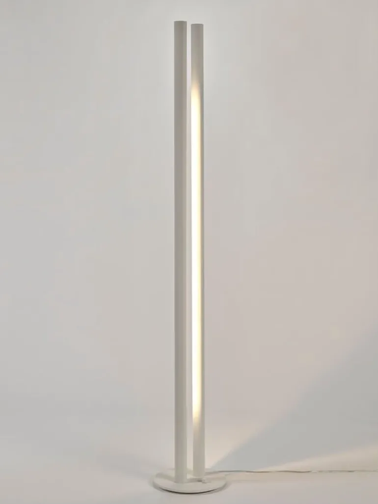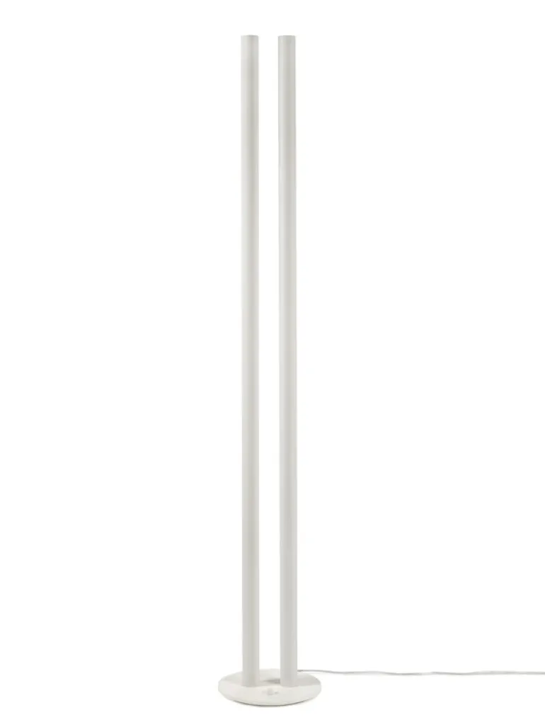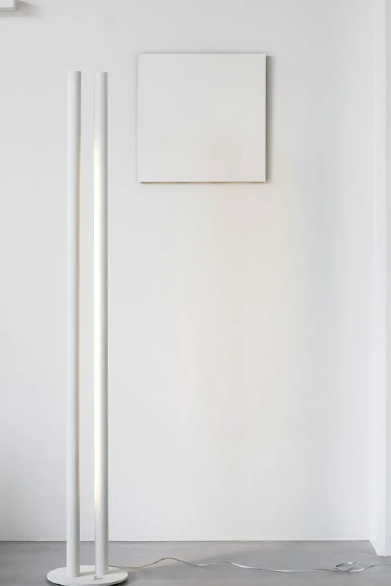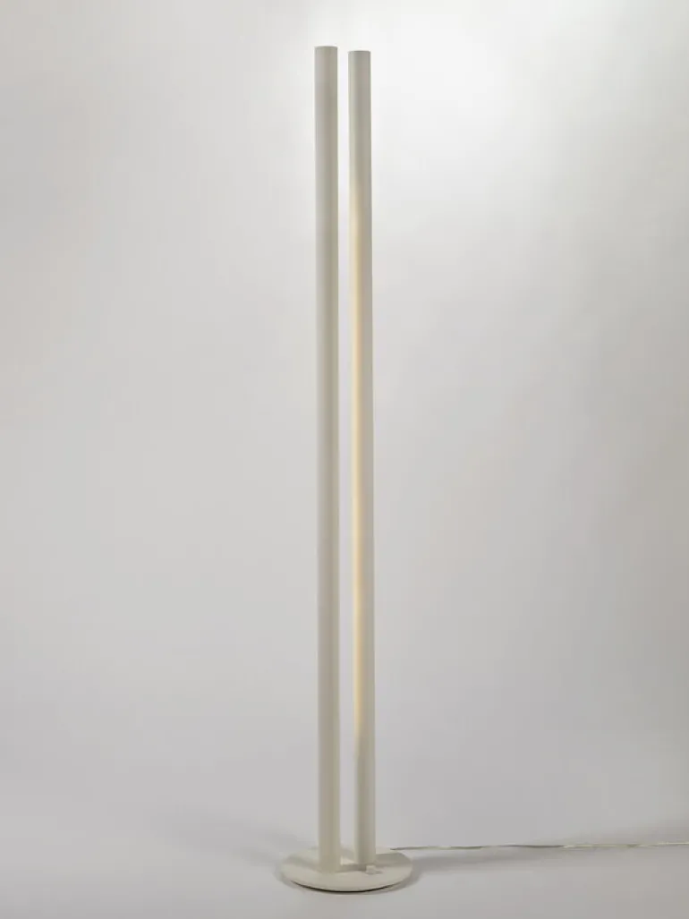 valerie objects Floor Lamp L1, formgiven av den belgiske arkitekten och formgivaren Pierric De Coster, är en modern ljusskulptur med en väldigt raffinerad men samtidigt iögonenfallande design. Floor Lamp L1 består av två aluminiumrör som står bredvid varandra och når 190 cm i höjd. I den ena cylindern finns en dimbar LED-enhet som riktar ljuset mot den andra cylindern, som reflekterar tillbaka ljuset, vilket skapar ett klart lysande, fritt svävande sken i mitten.