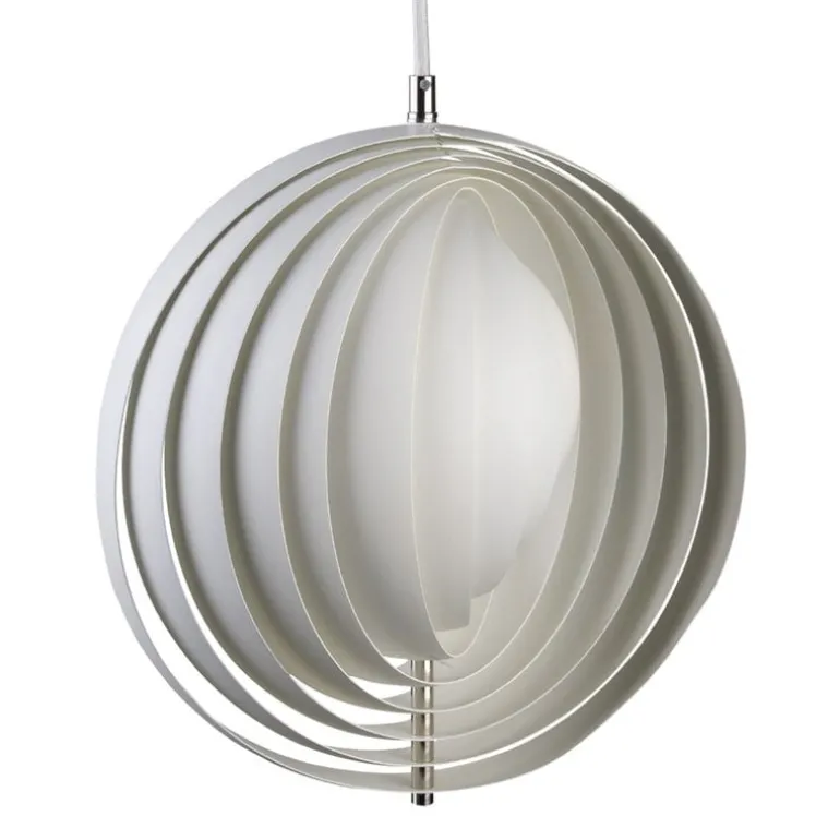 Moon-pendellampan skapades av Verner Panton 1960 och tillverkas idag av Verpan. Den är ett fantastiskt exempel på 1960-talets danska belysningsdesign. Pendellampan inspirerades av månens olika faser och består av fritt hängande ringformade lameller av stål. De öppnar sig som en fläkt och reflekterar mjukt och vitt ljus. Genom att justera stålringarna i olika lägen kan du leka med månens faser. Den distinkta armaturen är ett vackert blickfång ovanför matbordet eller i vardagsrummet.