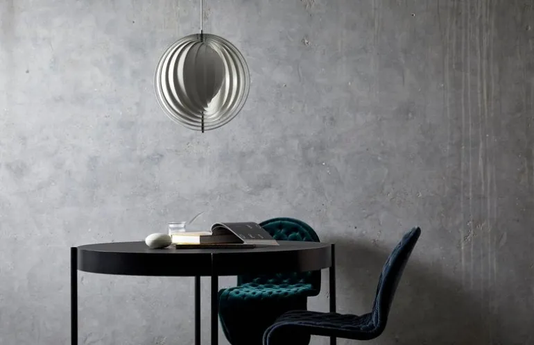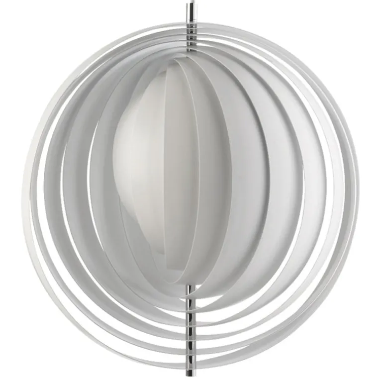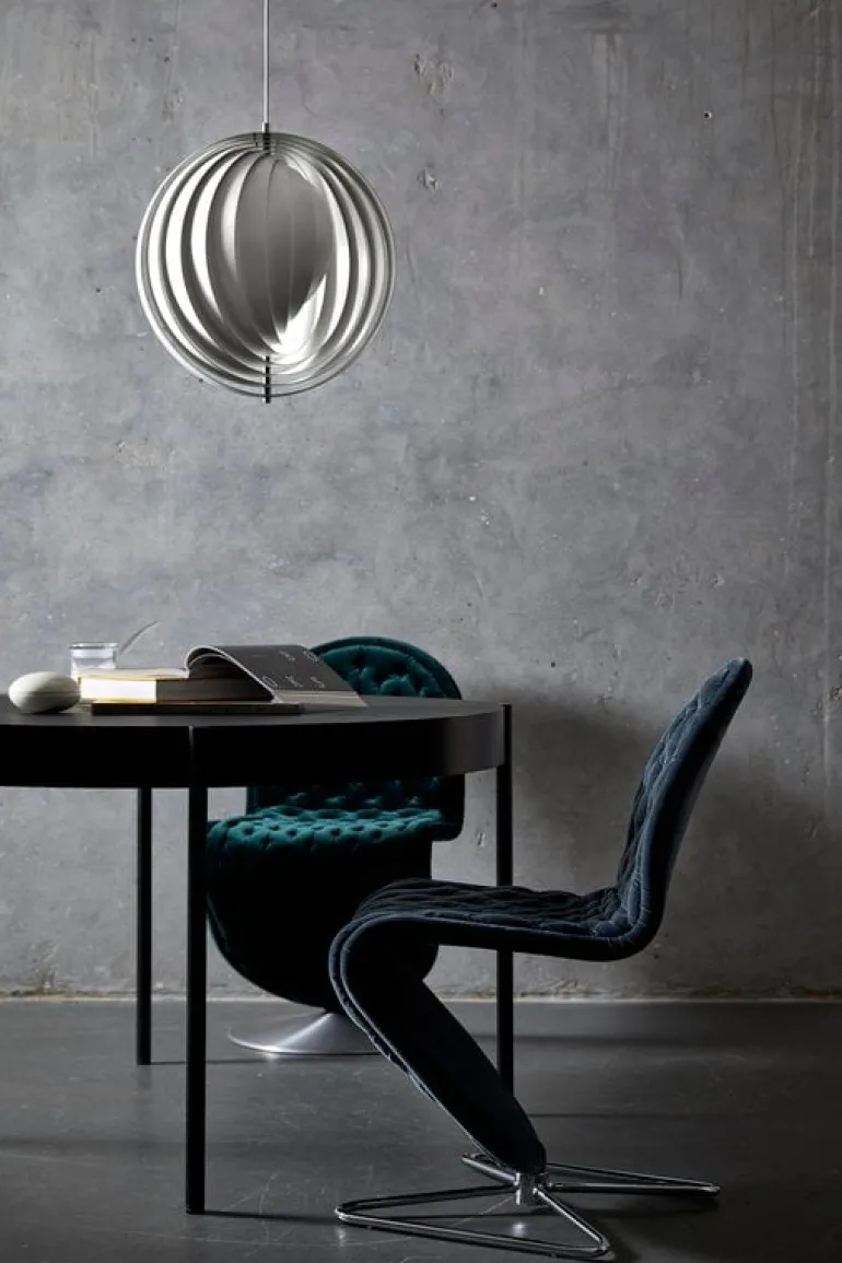 Moon-pendellampan skapades av Verner Panton 1960 och tillverkas idag av Verpan. Den är ett fantastiskt exempel på 1960-talets danska belysningsdesign. Pendellampan inspirerades av månens olika faser och består av fritt hängande ringformade lameller av stål. De öppnar sig som en fläkt och reflekterar mjukt och vitt ljus. Genom att justera stålringarna i olika lägen kan du leka med månens faser. Den distinkta armaturen är ett vackert blickfång ovanför matbordet eller i vardagsrummet.