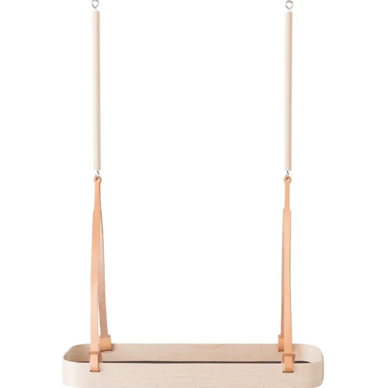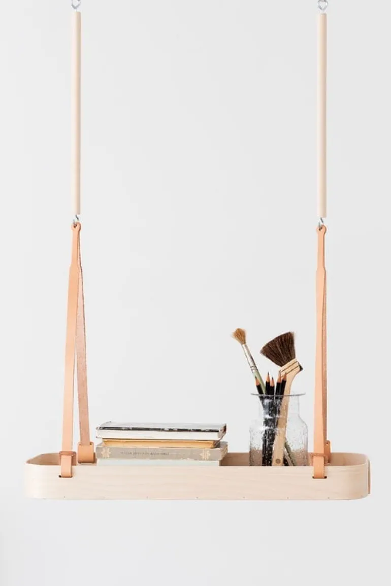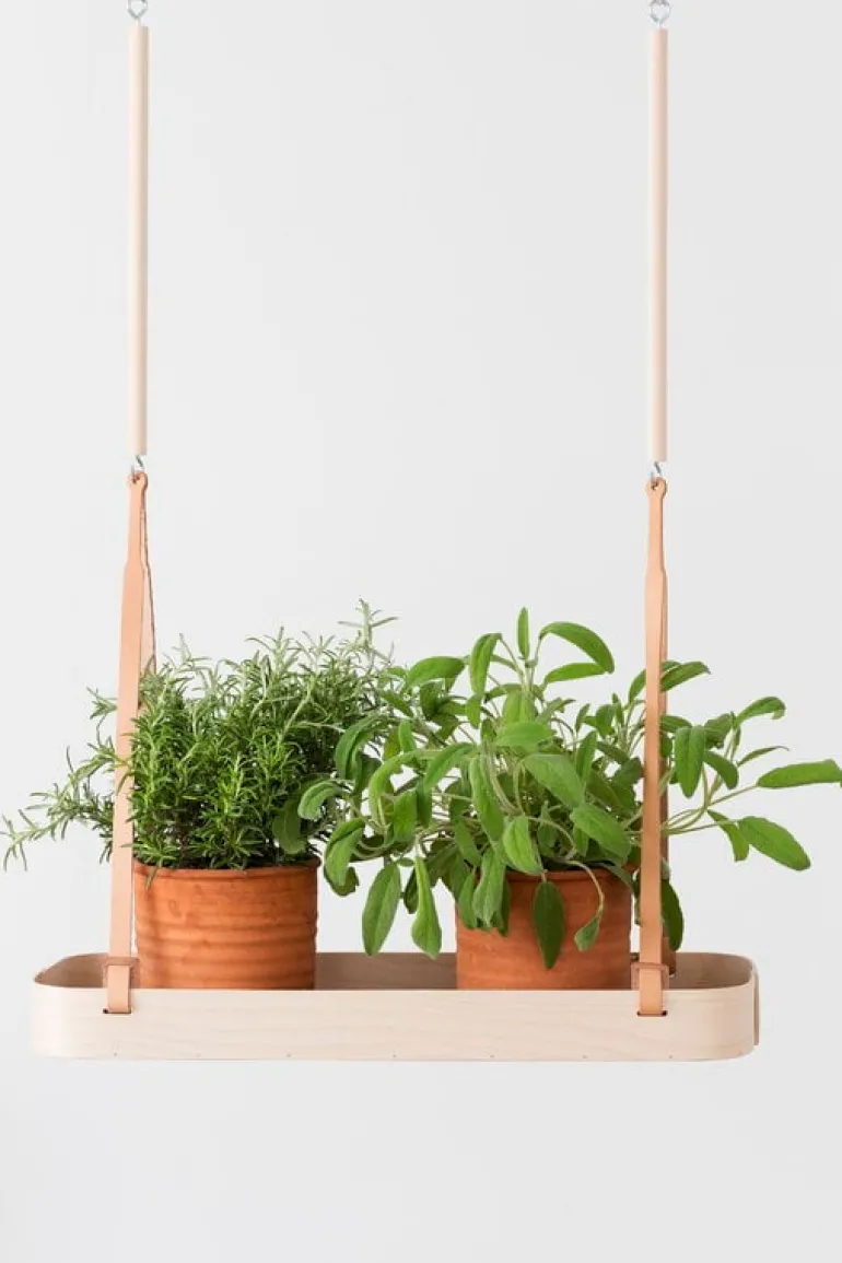 Hängande hyllan Tuokko av finska Verso Design ger en luftig, organisk miljö för förvaring av kryddkrukor, blommor och små föremål. Den rektangulära hyllan kan hängas från taket med små läderbälten och en trästång. Tuokko-brickor och hyllor är tillverkade av björk och har en undersida i mjuk filt.