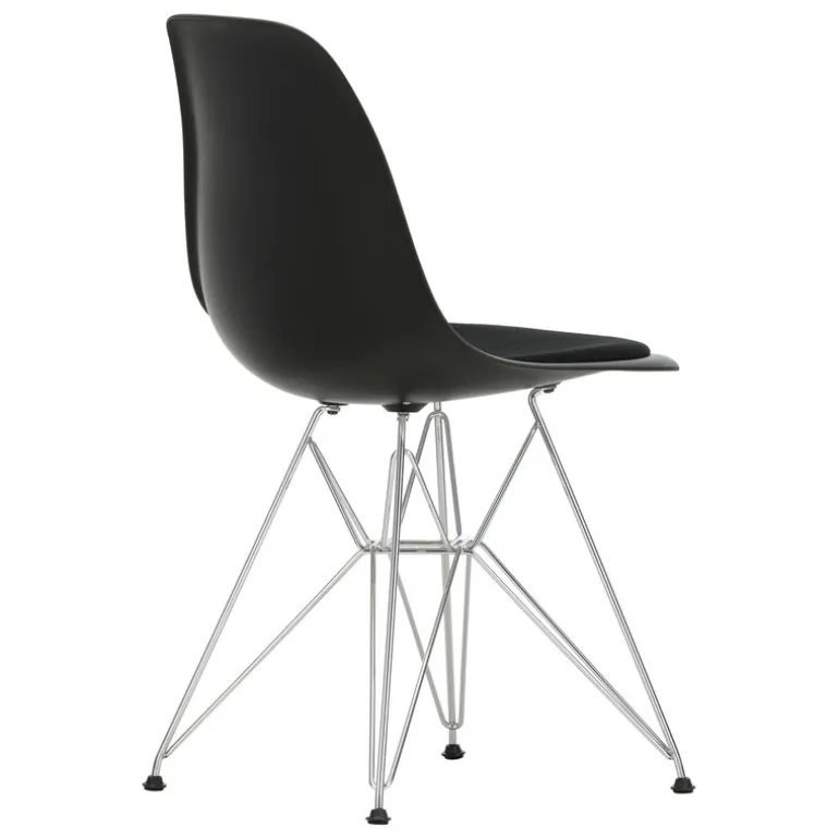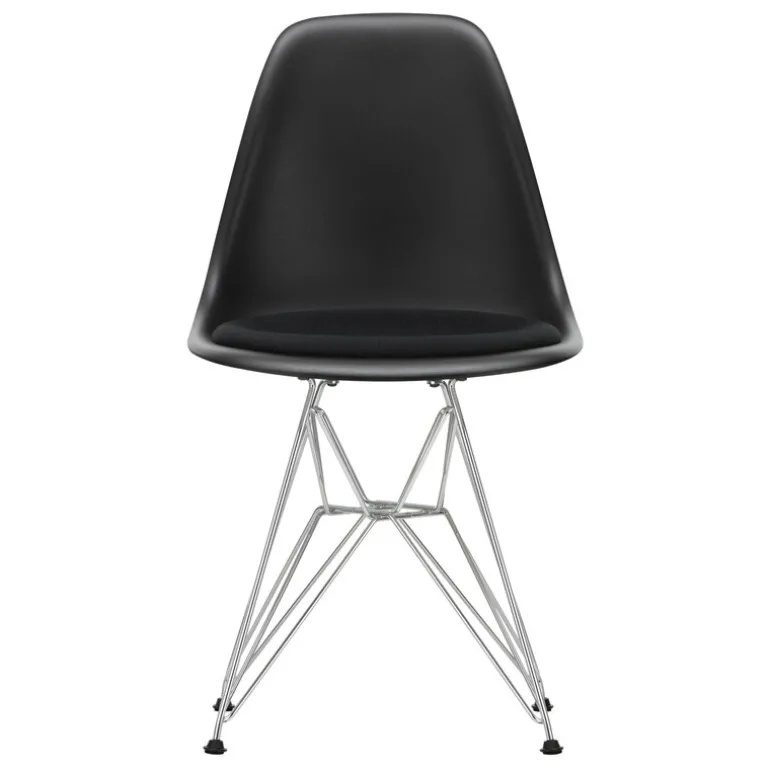 Vitras Eames DSR-stol är också känd som Eiffel-stolen på grund av den grafiska korsstruktur som dess metallben bildar. Namnet DSR kommer från orden Dining Height Side Chair Rod Base. Denna stol levereras med en sitskudde som är fastskruvad i sitskalet och klädd i ett slitstarkt tyg som kompletterar tonen på sitsen i polypropen.