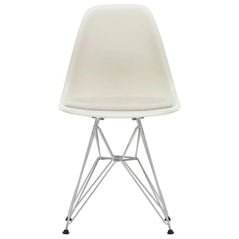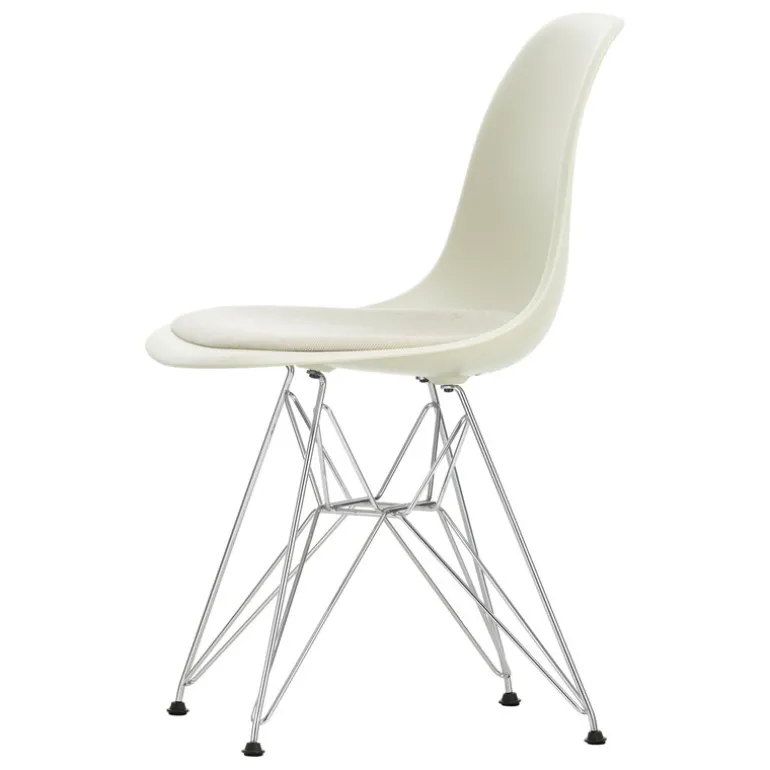 Vitras Eames DSR-stol är också känd som Eiffel-stolen på grund av den grafiska korsstruktur som dess metallben bildar. Namnet DSR kommer från orden Dining Height Side Chair Rod Base. Denna stol levereras med en sitsdyna som är fastskruvad i sitsen och klädd i ett slitstarkt tyg som kompletterar tonen på sitsen i polypropen.