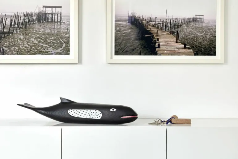 Eames House Whale är en förtjusande, nedskalad modell av den två meter stora träval som var ett av favoritobjekten i Charles och Ray Eames hem. Originalet skapades av en anonym nordamerikansk folkkonstnär och hängde från taket i Eames-huset. Den förekommer även på flertalet bilder på andra produkter från Eames. Vitra tillverkar nu den 70 cm långa, handmålade Eames House Whale i alträ. Den är ett rent nöje att betrakta, oavsett om den är placerad i fönstret, på ett bord eller hängande från taket.