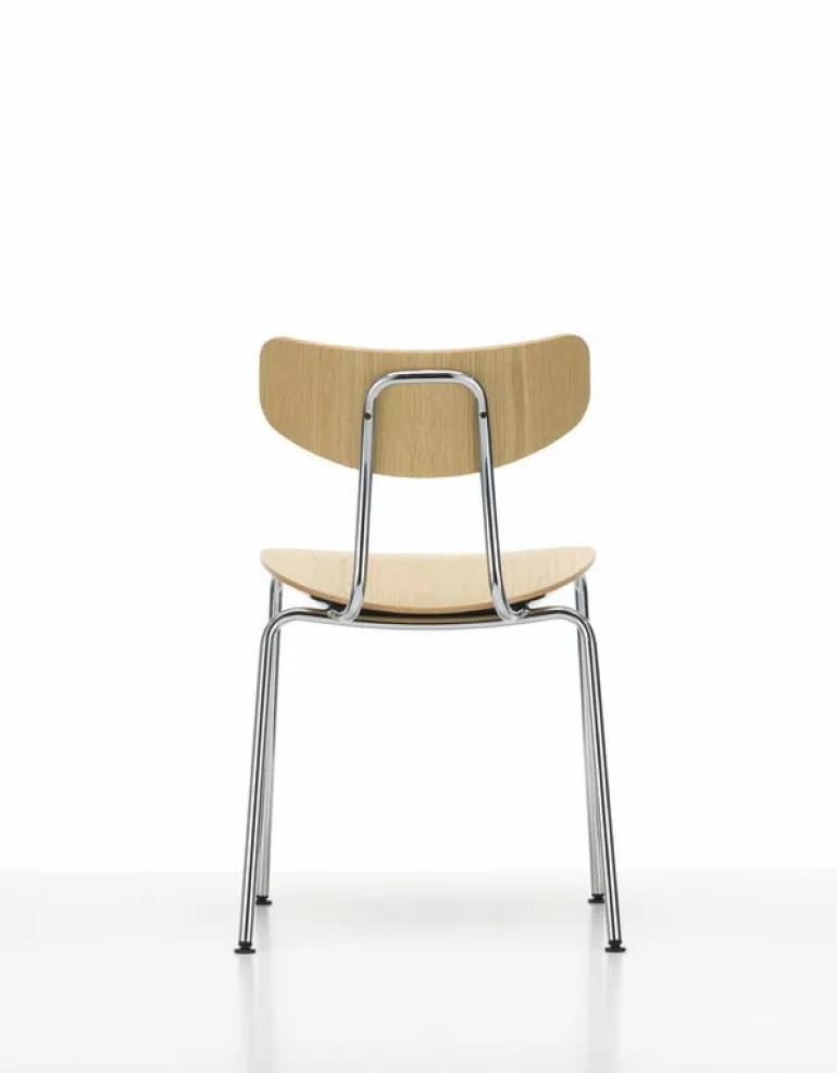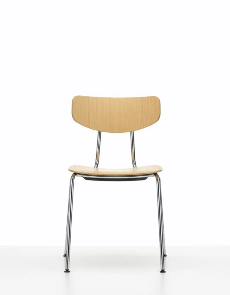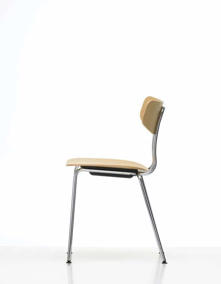 Ramen består av två metallrör, varav det ena bildar dess bakben och det andra frambenen samt ryggstödet. Sits och ryggstöd är tillverkade av fanerklädd plywood, vilket gör stolen lätt och därför enkel att flytta eller stapla. En titt under stolen avslöjar en liten men praktisk detalj som är väldigt typisk för Morrison: sitsens botten är täckt med ett skydd som förhindrar att fanerytan repas när stolen staplas.