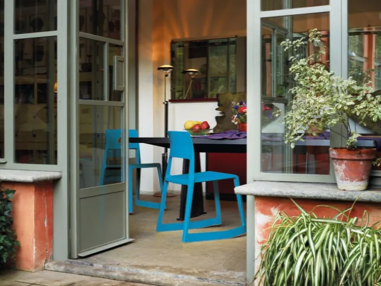 Stolen Tip Ton från Vitra fångar allas blickar med sin speciella basstruktur som gör att stolen kan lutas några grader framåt. Enligt den forskning som utförts vid universitetet ETH Zürich i Schweiz aktiverar en något framåtriktad sittställning rygg- och magmuskler och hjälper på så sätt kroppen att få mer syre. Stolen Tip Ton, designad av Edward Barber och Jay Osgerby, är gjord av slitstark och återvinningsbar plast, och den har inga lösa, mekaniska delar. Tip Ton tar sig väl ut på kontoret, i köket eller någon annanstans i huset, och den finns i många olika färger.