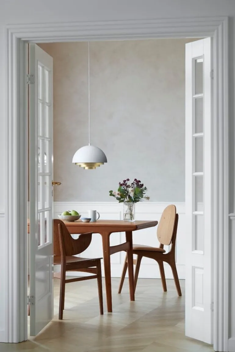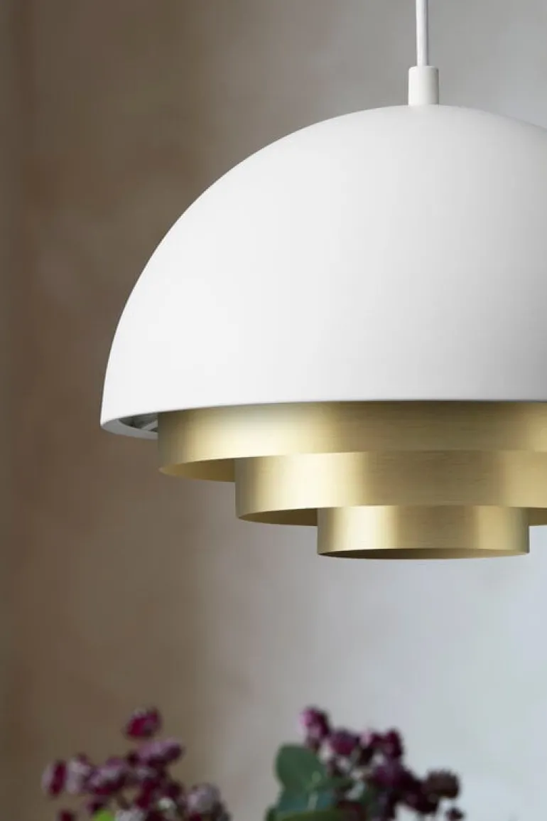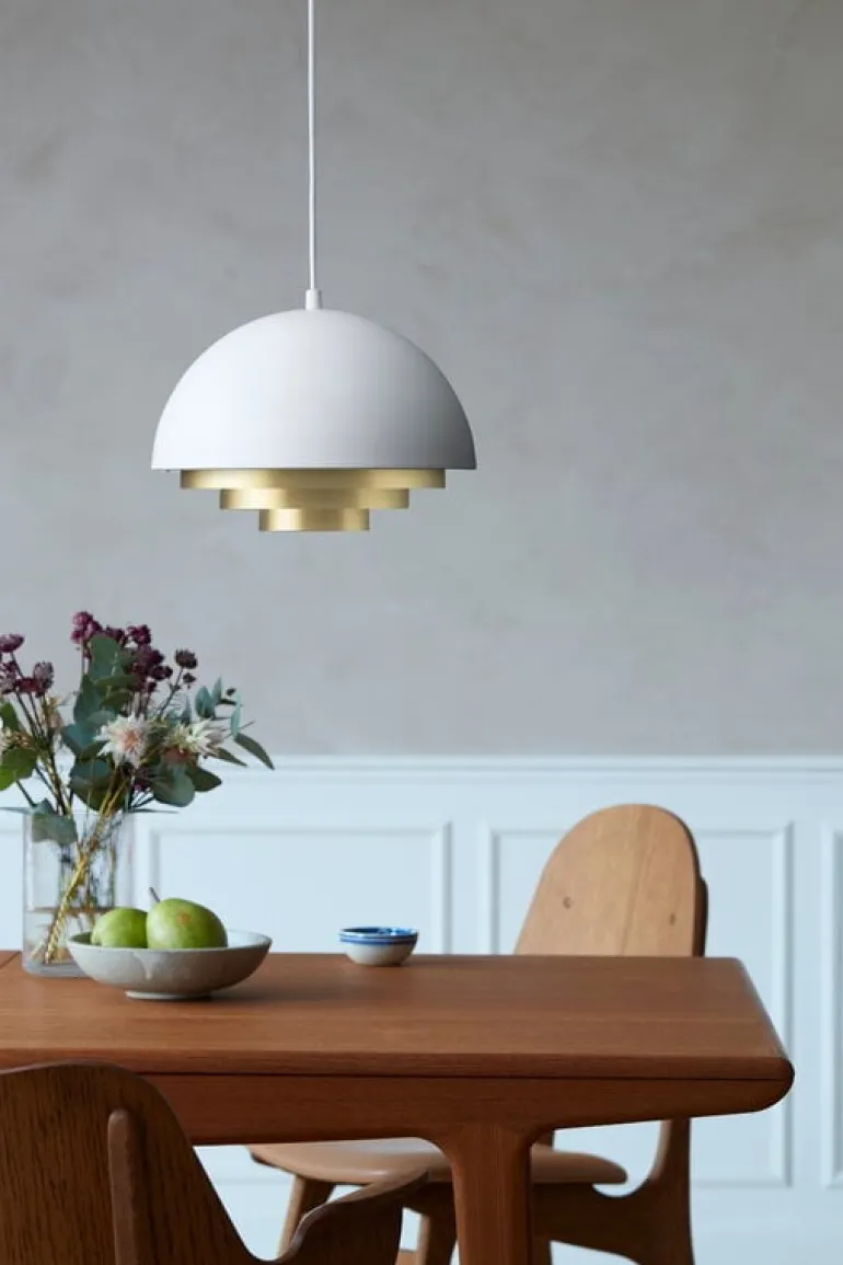 Med sin konstruktion av mässing och målat stål har hänglampan Milieu Colour Mini en lagerdesign som ger ett mjukt och bländfritt nedåtriktat ljus. Milieu Colour Mini ser vacker ut som en matsalslampa eller, i större utrymmen, hängande i kluster.