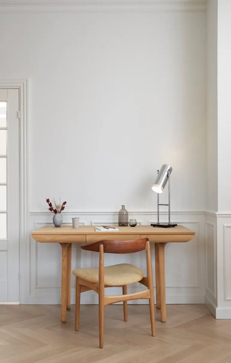 Warm Nordics Trombone-bordslampa har en smal, cylindrisk metallskärm med en vit insida som reflekterar ljuset från båda ändarna av skärmen. Kanterna är perforerade med tunna vertikala slitsar, vilket gör att ljuset skiner igenom på ett vackert sätt. Trombone-bordslampan står på stålbensfästen som är fästa vid en kvadratisk bas, och dess skärm kan lutas upp och ner.