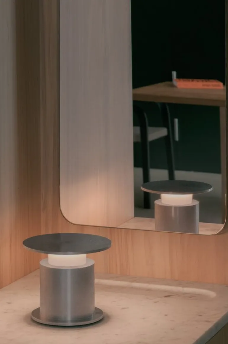 Lampan är tillverkad av tumlad aluminium och har en rå, obelagd yta som utvecklar en allt större karaktär med tiden, när små repor, fingeravtryck och oxideringar förvandlas till en vacker patina.