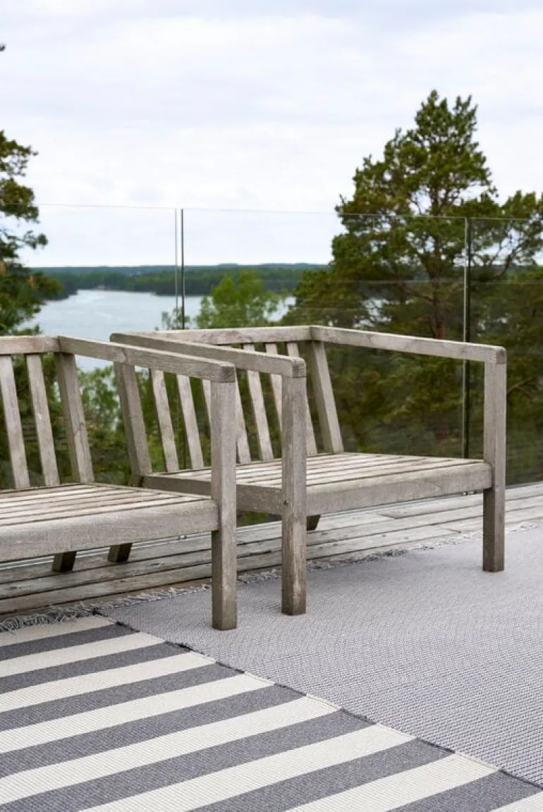 Big Stripe In-Out mattan från Woodnotes är tillverkad av fukt- och blekningsresistent polypropylen, vilket gör den väl lämpad för kök och barnrum samt balkonger, uteplatser och andra utomhusområden. Big Stripe-mattan är också en utmärkt och praktisk utomhusmatta för poolområden eller strandhus, eftersom polypropylenfibrer står emot klor och saltvatten.