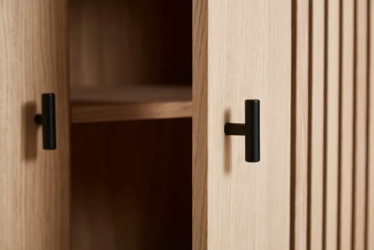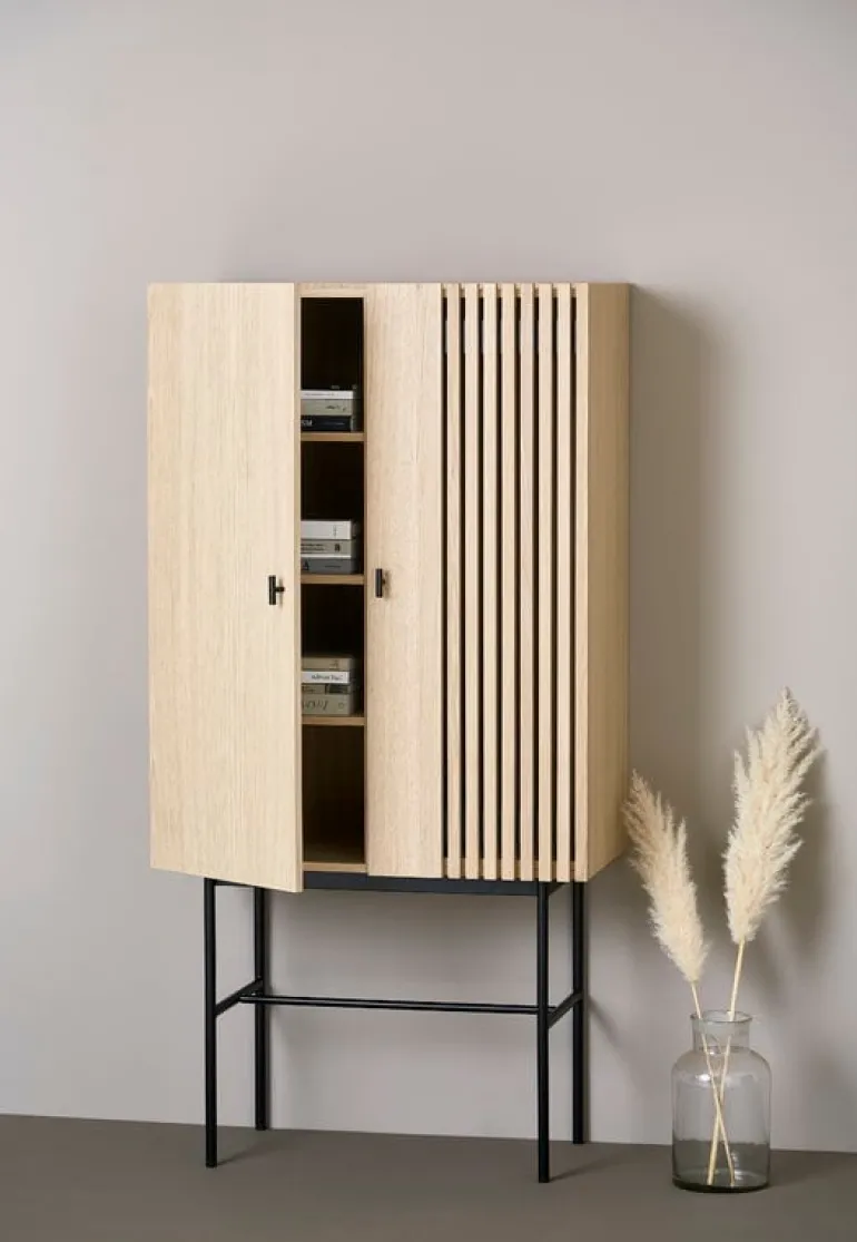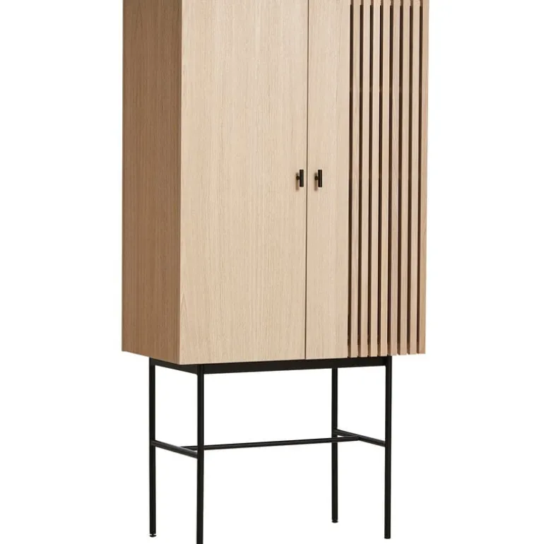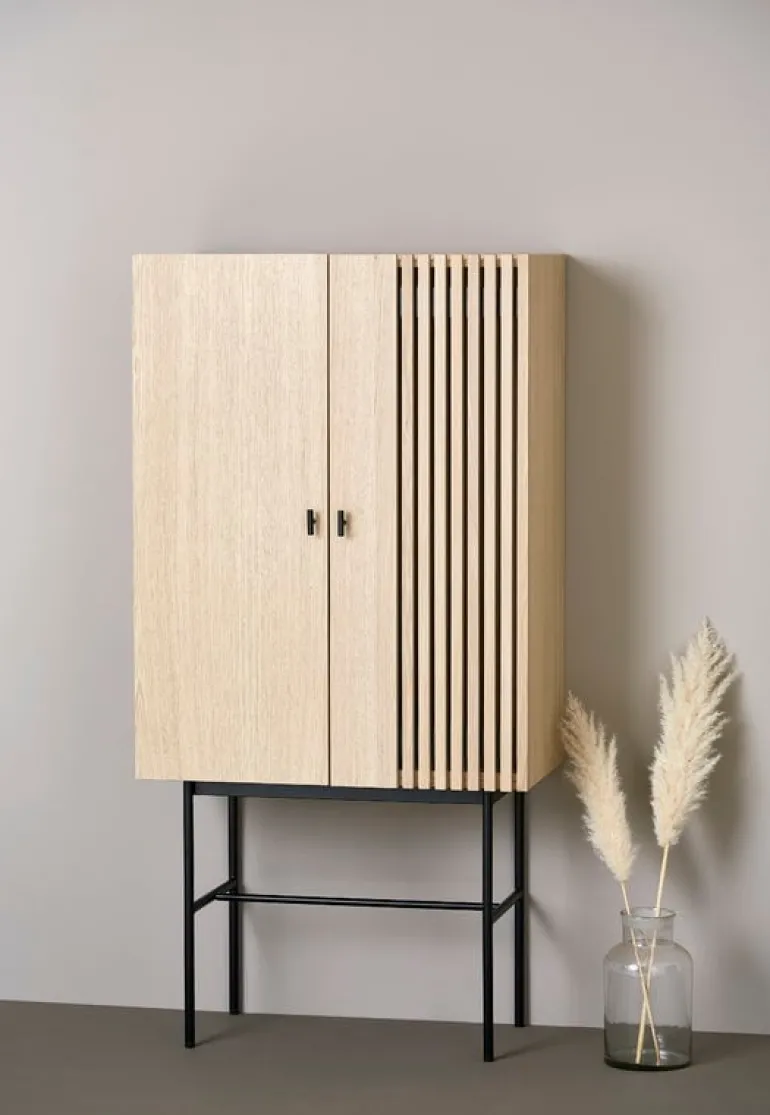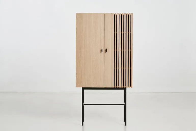 Array av Woud kombinerar en smal metallram med ett skåp i ekfaner. Designstudion Says Who hämtade inspiration till dörrens vertikala stänger i modern arkitektur. Bakom dörrarna hittar du åtta praktiska fack för förvaring av porslin, kläder, leksaker och kontorsmaterial. Samspelet med ljus och skuggor ger Array ett stilfullt, men ändå unikt, utseende som passar alla typer av inredning.