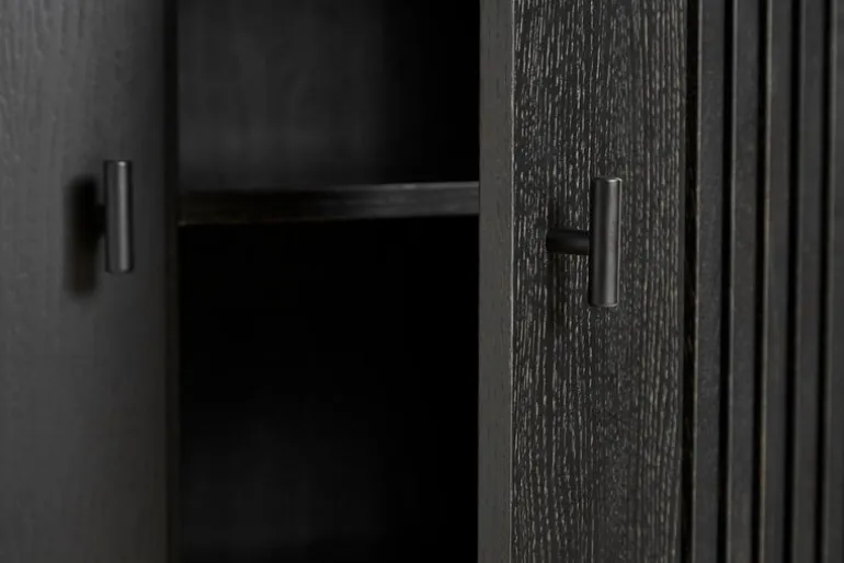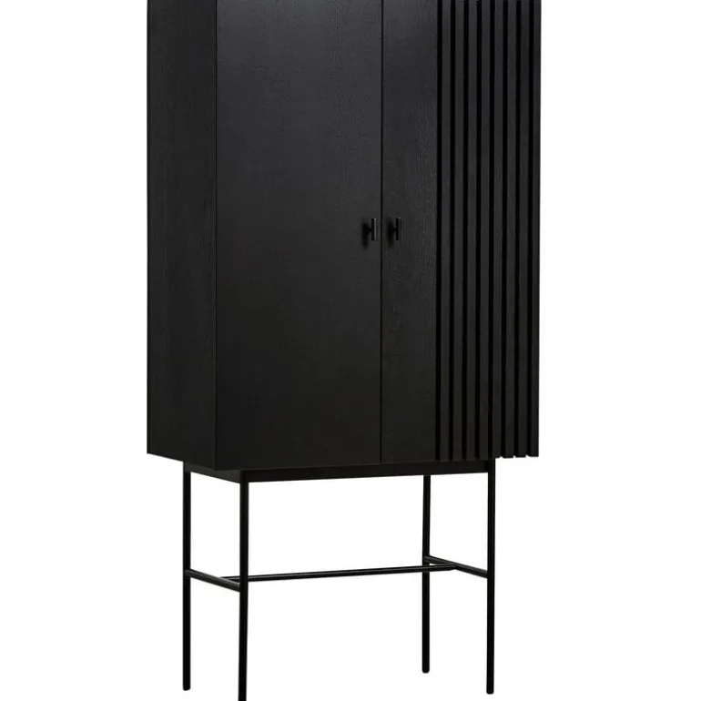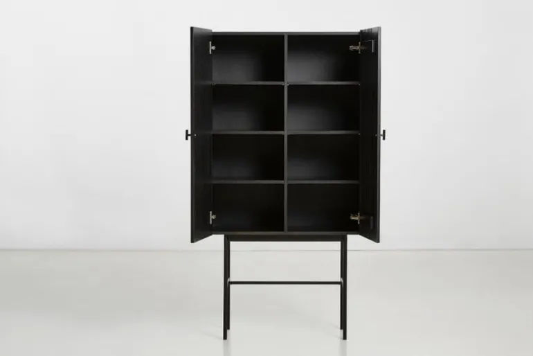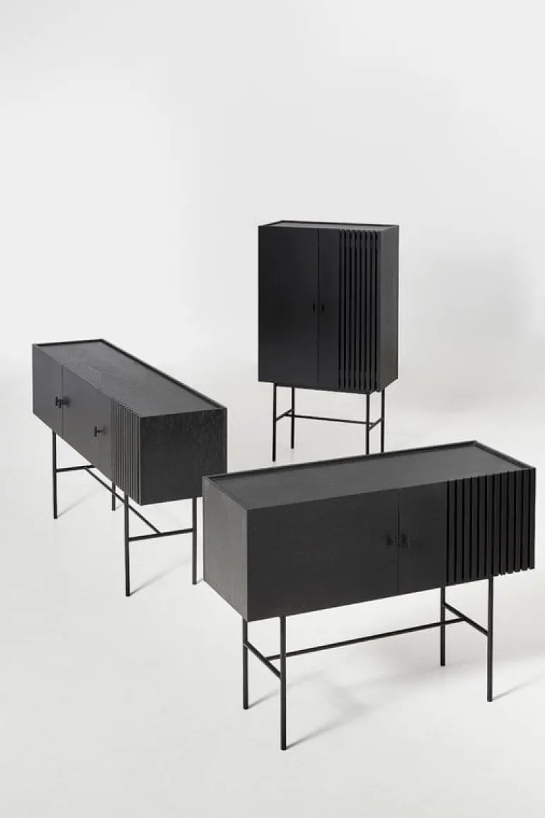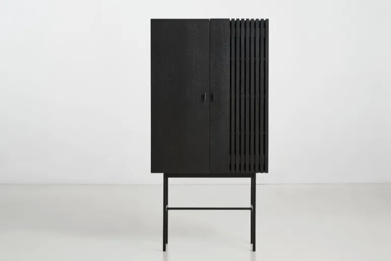 Array av Woud kombinerar en smal metallram med ett skåp i ekfaner. Designstudion Says Who hämtade inspiration till dörrens vertikala stänger i modern arkitektur. Bakom dörrarna hittar du åtta praktiska fack för förvaring av porslin, kläder, leksaker och kontorsmaterial. Samspelet med ljus och skuggor ger Array ett stilfullt, men ändå unikt, utseende som passar alla typer av inredning.