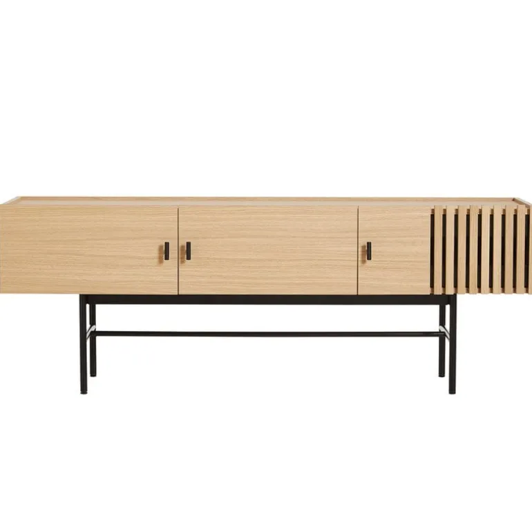 Array sideboard från Woud består av en smal metallram med ett skåp i ekfaner. Designstudion Says Who hämtade inspiration till dörrens vertikala stänger i modern arkitektur. Bakom luckorna hittar du tre praktiska fack för förvaring av porslin, kläder, leksaker eller kontorsmaterial. Samspelet med ljus och skuggor ger Array ett stilfullt, men ändå unikt, utseende som passar alla typer av inredning.