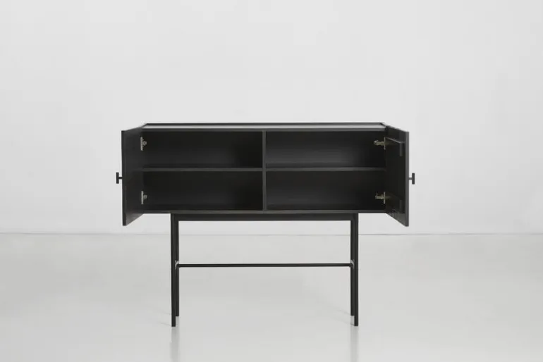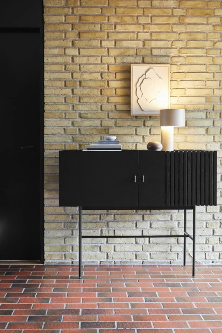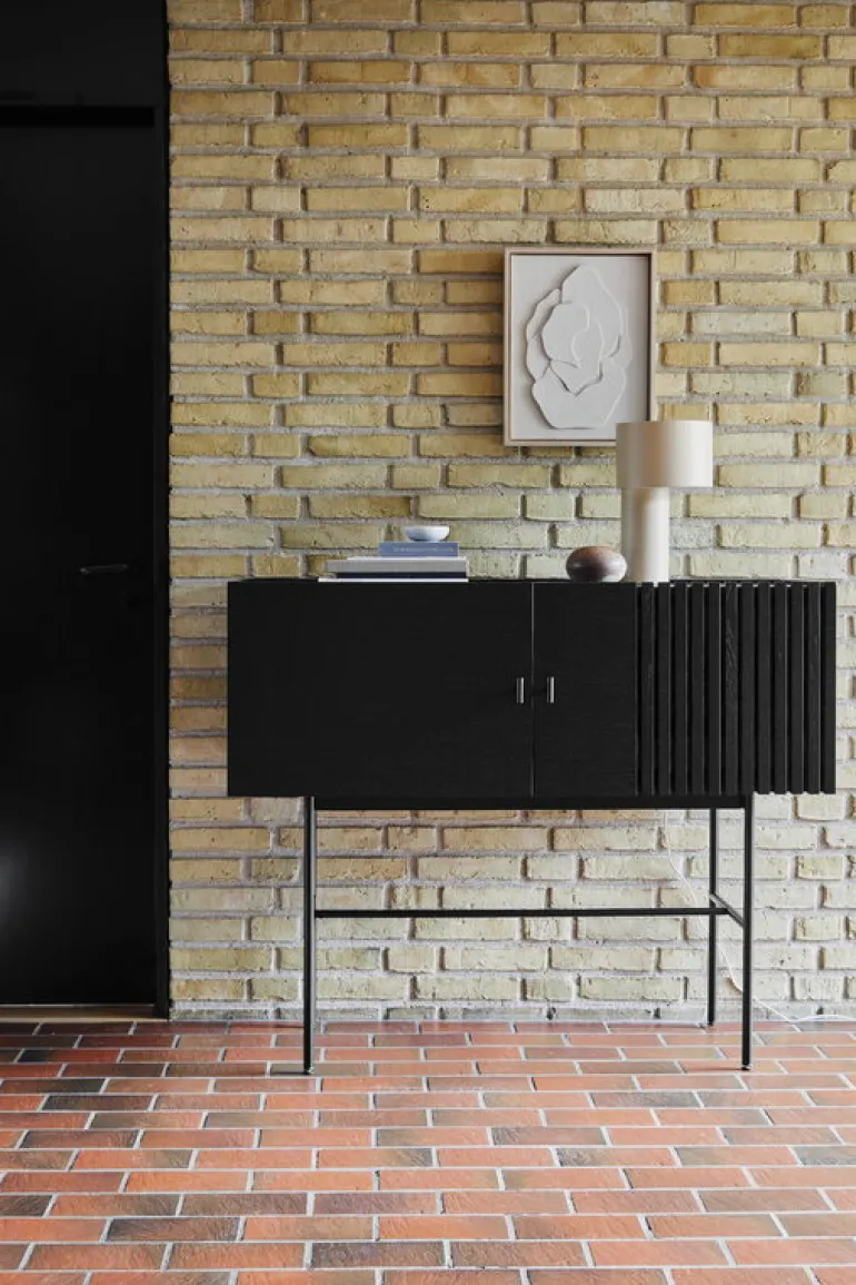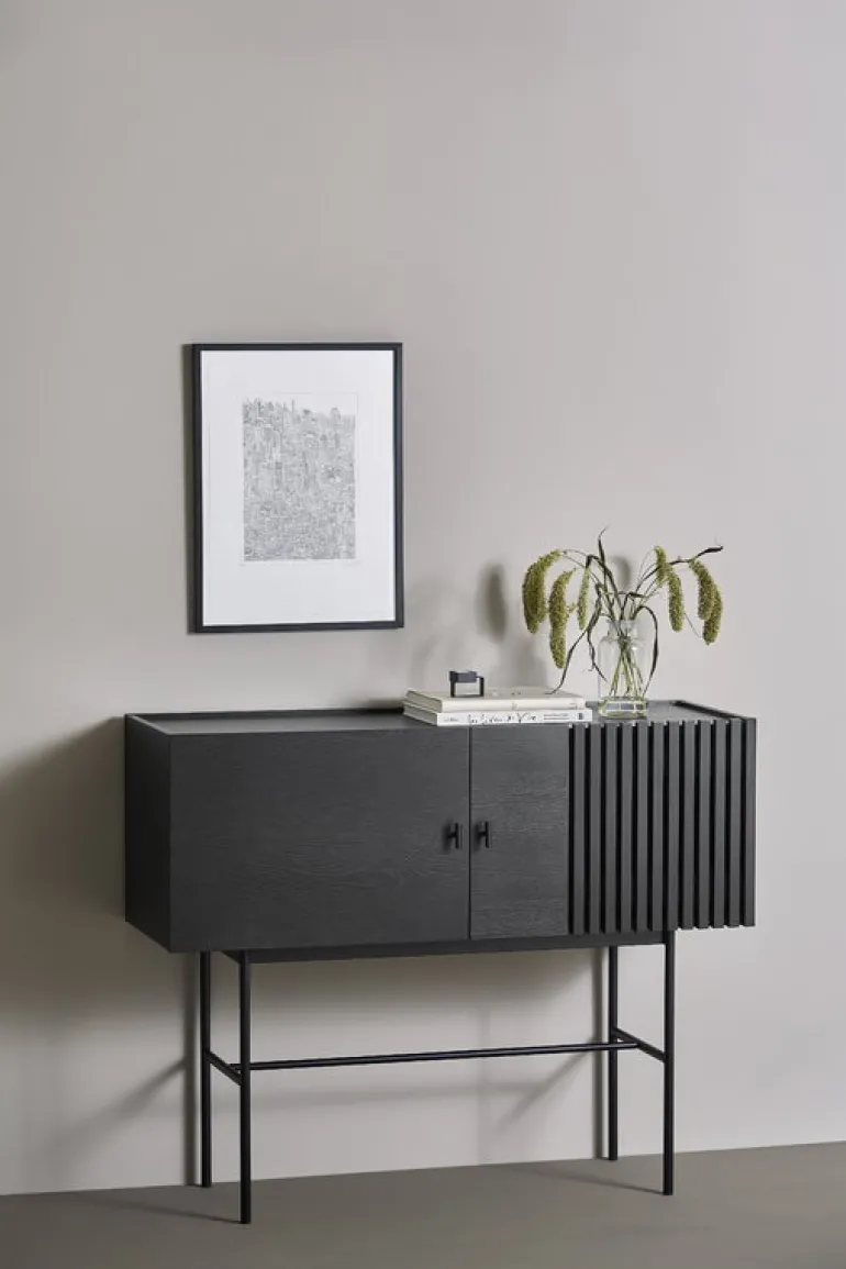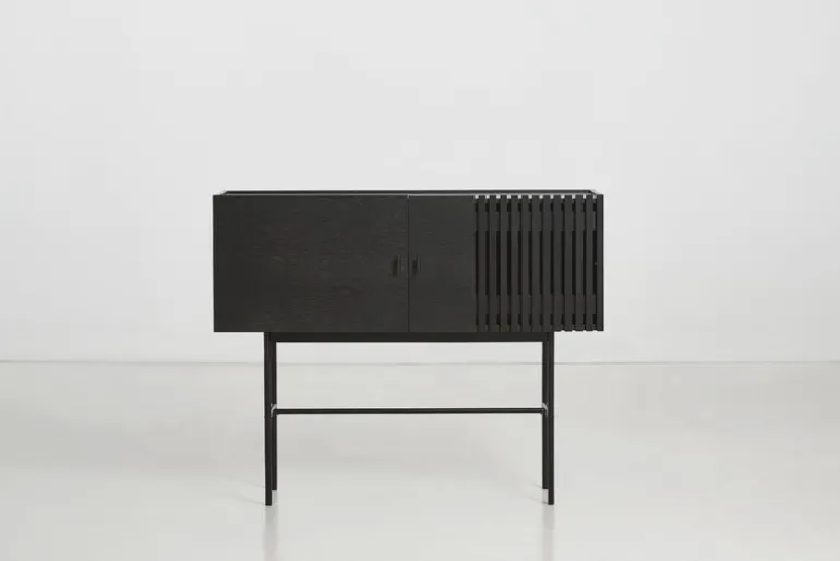 Array sideboard av Woud kombinerar en smal metallram med ett skåp i ekfaner. Designstudion Says Who hämtade inspiration till dörrens vertikala stänger i modern arkitektur. Bakom dörrarna hittar du fyra praktiska fack för förvaring av porslin, kläder, leksaker och kontorsmaterial. Samspelet med ljus och skuggor ger Array ett stilfullt, men ändå unikt, utseende som passar alla typer av inredning.