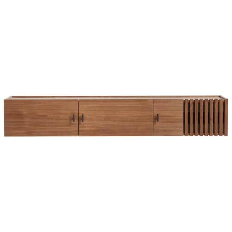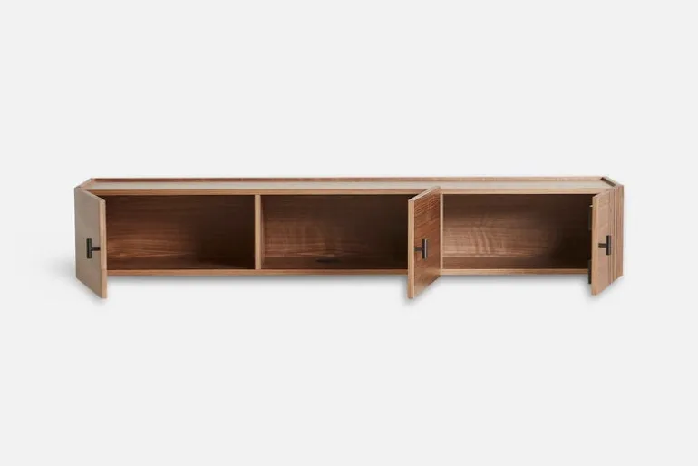 Array sideboard från Woud är en elegant förvaringslösning för hem eller kontor. Dörren till det väggmonterade skåpet är dekorerad med vertikala lameller, vilka är inspirerade av modern arkitektur. Bakom dörrarna hittar du tre praktiska fack för förvaring av porslin, kläder, leksaker samt kontorsmaterial. Lekfullheten med ljus och skuggor ger Array ett förfinat men distinkt utseende som kompletterar alla typer av inredningar.