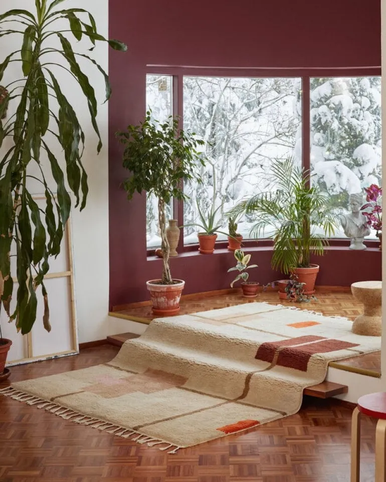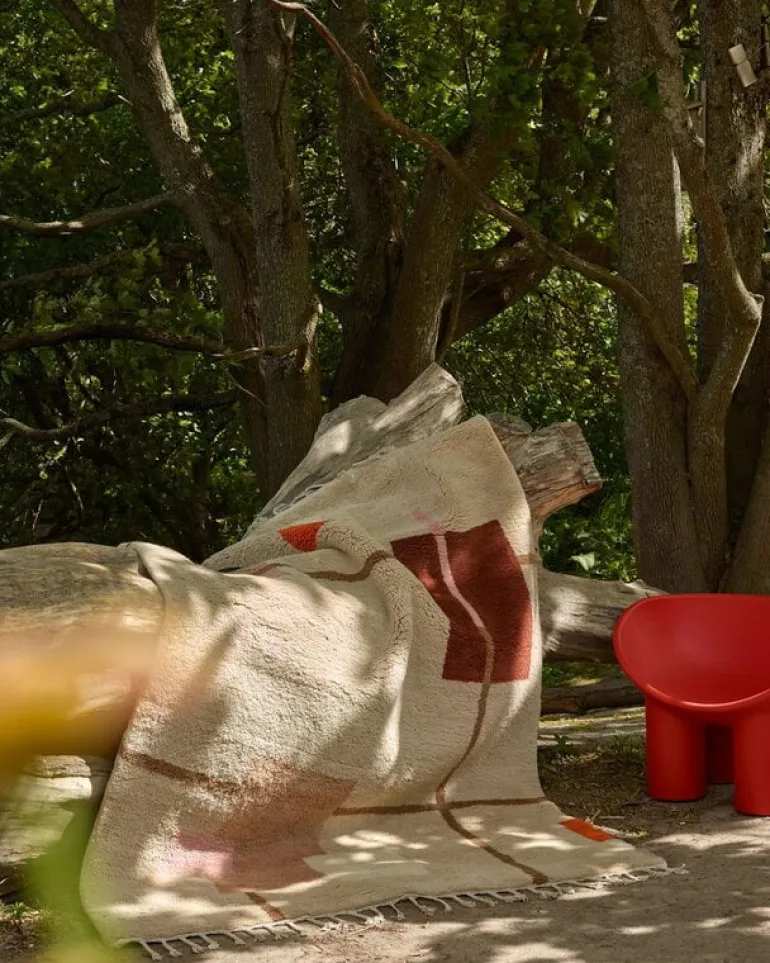 Mattan Patch 01 från Woven Works visar upp ett elegant arrangemang av geometriska mönster och har en hög yllelugg med fluffig, taktil känsla. Den raggiga ullmattan har en färgpalett där jordnära nyanser förenas med klara accentfärger, medan kanterna pryds av flätade fransar.