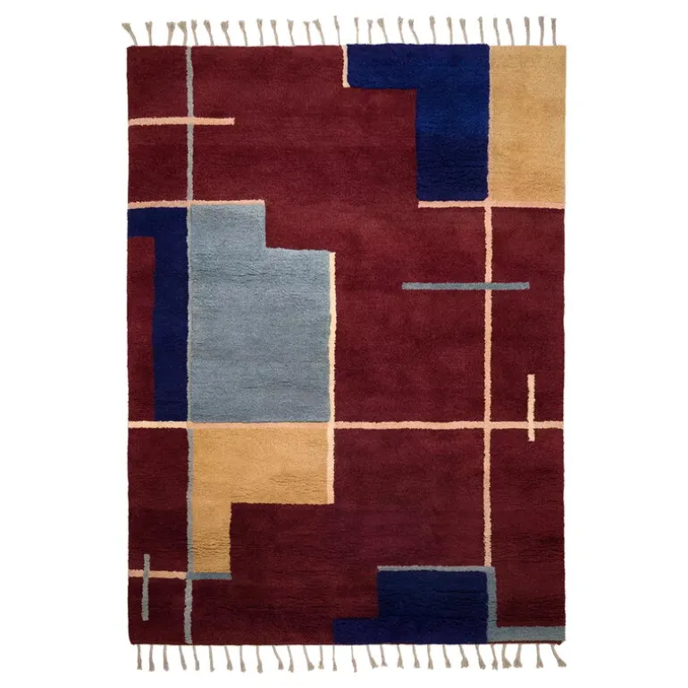 Mattan Path 01 från Woven Works känns igen på sina markanta, geometriska mönster och sin fascinerande, tredimensionella yta, där ullgarn med två olika lugghöjder huserar. De högre sektionerna ger den här raggiga ullmattan volym, karaktär och en mer kraftfullt taktil känsla. Mattans varma, mustiga färgpalett är kompletterad med vita, flätade fransar.
