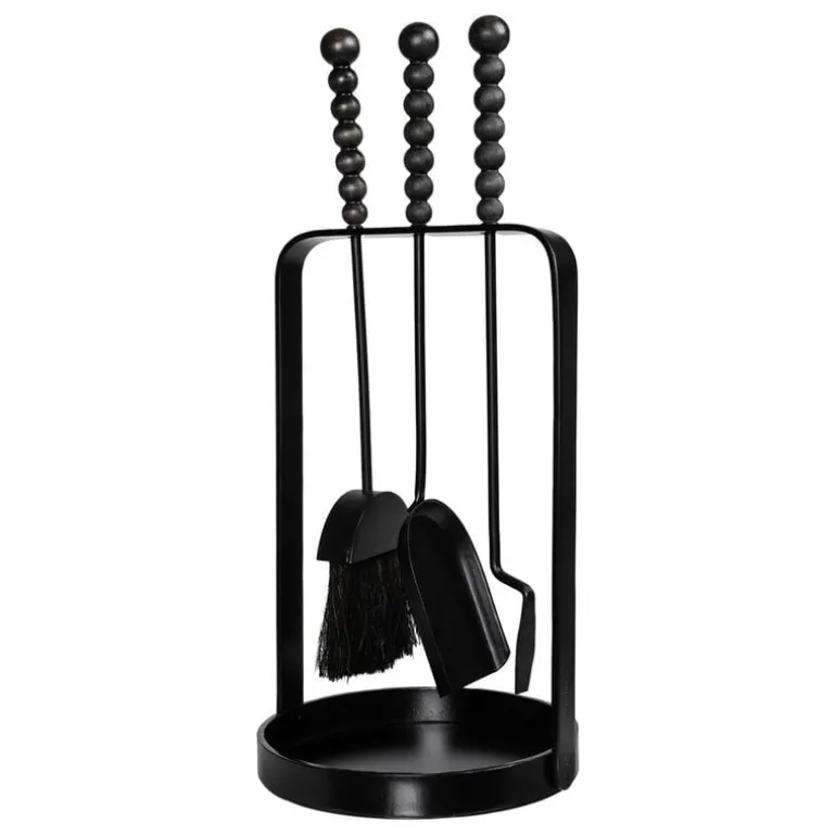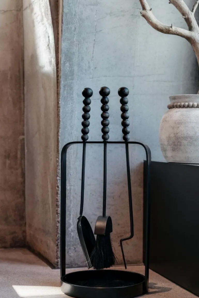 Aarikkas eldstadsset Nuppu kombinerar traditionellt finskt hantverk med en modern touch. Setet innehåller en pulverlackerad skopa i järn, en kolhake och en eldborste med borst av kokosfiber. Handtagen är smyckade med Aarikkas signatur, stora träpärlor, som är tillverkade av behandlad lönn.