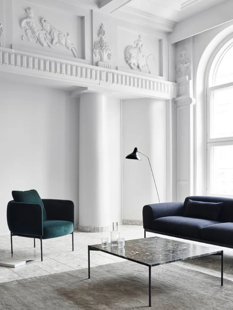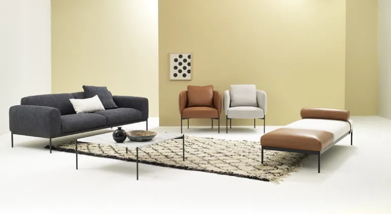 Bon A232-soffan från Adea har ett fräscht, modernt utseende som är ett resultat av den eleganta metallramen i kombination med den lediga, klädda sitsen.