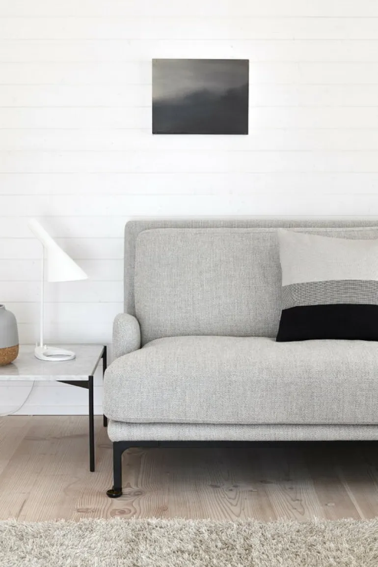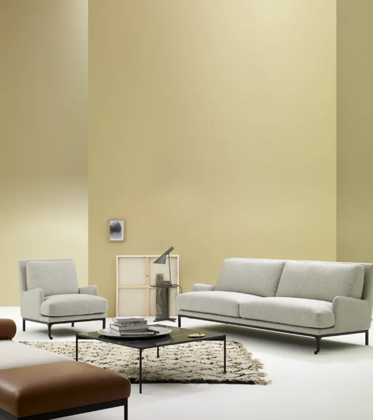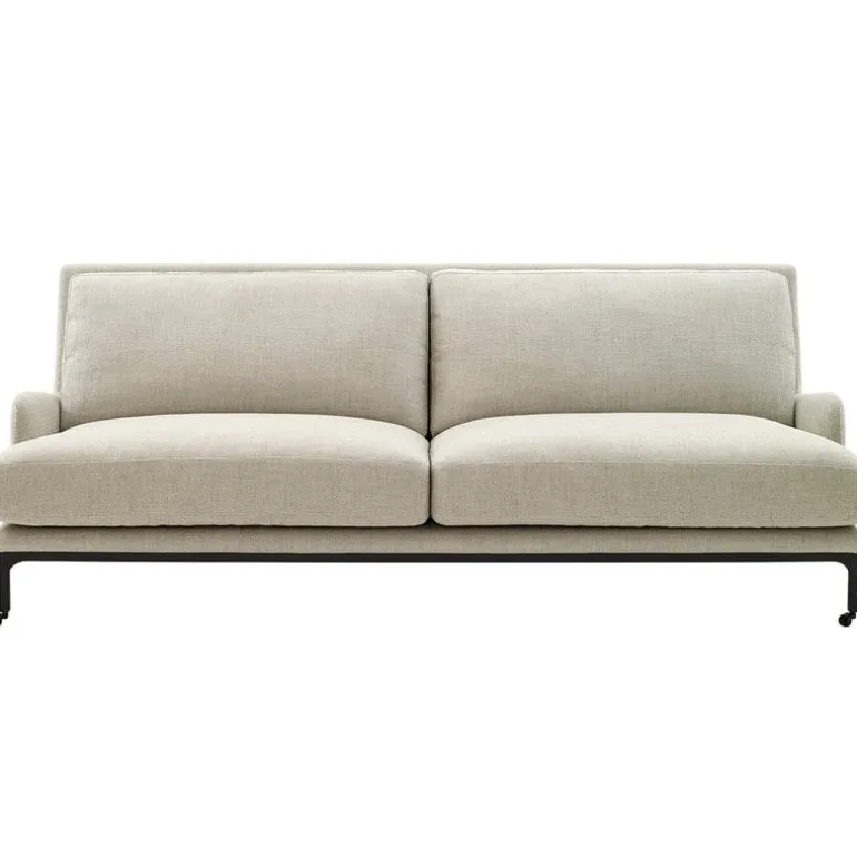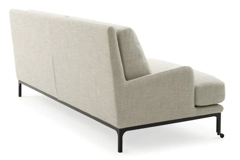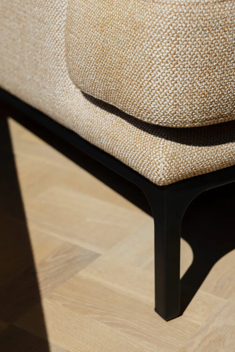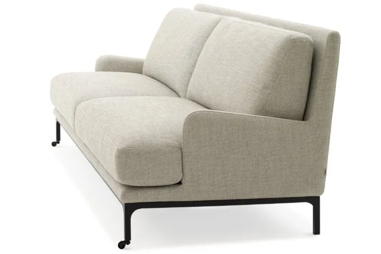 Adeas soffa Mr. Jones kännetecknas av flödande linjer och generösa kuddar som kontrasteras av den svarta metallramen med hjul framtill.