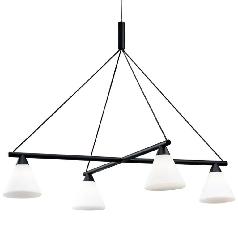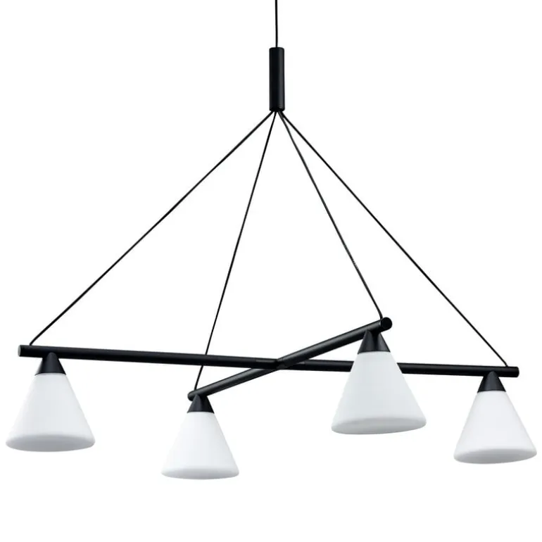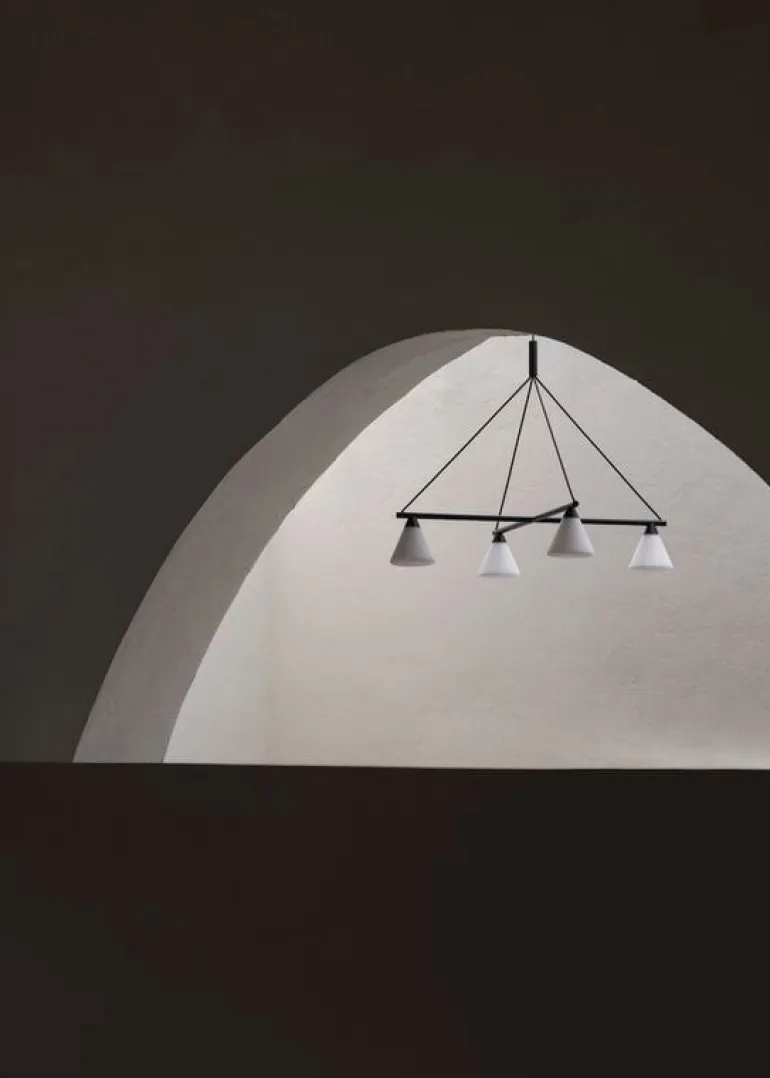 AGOs ljuskrona Probe är en komposition av en svart, geometrisk metallbas och konformade skärmar i matt opalglas. Den ger ett mjukt, diffust sken som passar bra i matsalen eller vardagsrummet.