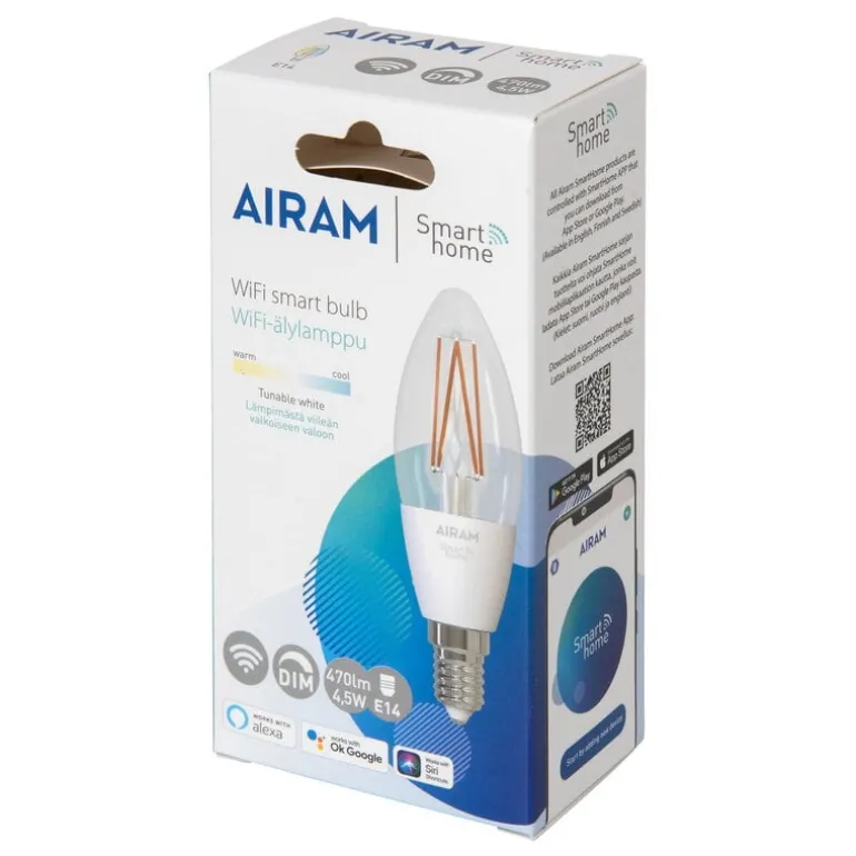 LED-lampan Airam från SmartHome ger dig trådlös, smart belysning med praktiska, lättanvända styrfunktioner. Det går att justera färgtemperaturen (CCT) på den här kronljuslampan via en mobilapp, från varmt vitt (2 700 K) till kallt vitt dagsljus (6 500 K) – de klara lamporna är även dimbara.