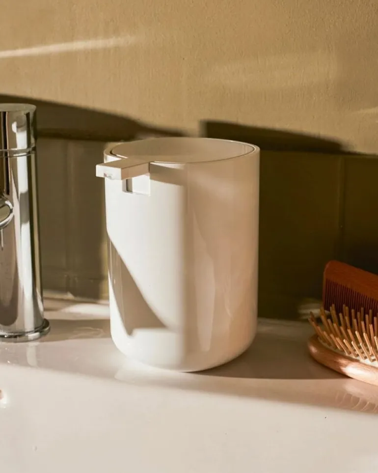 Alessis tvåldispenser Birillo är tillverkad av tålig, lättrengjord termoplastisk harts med en vit högglansfinish.