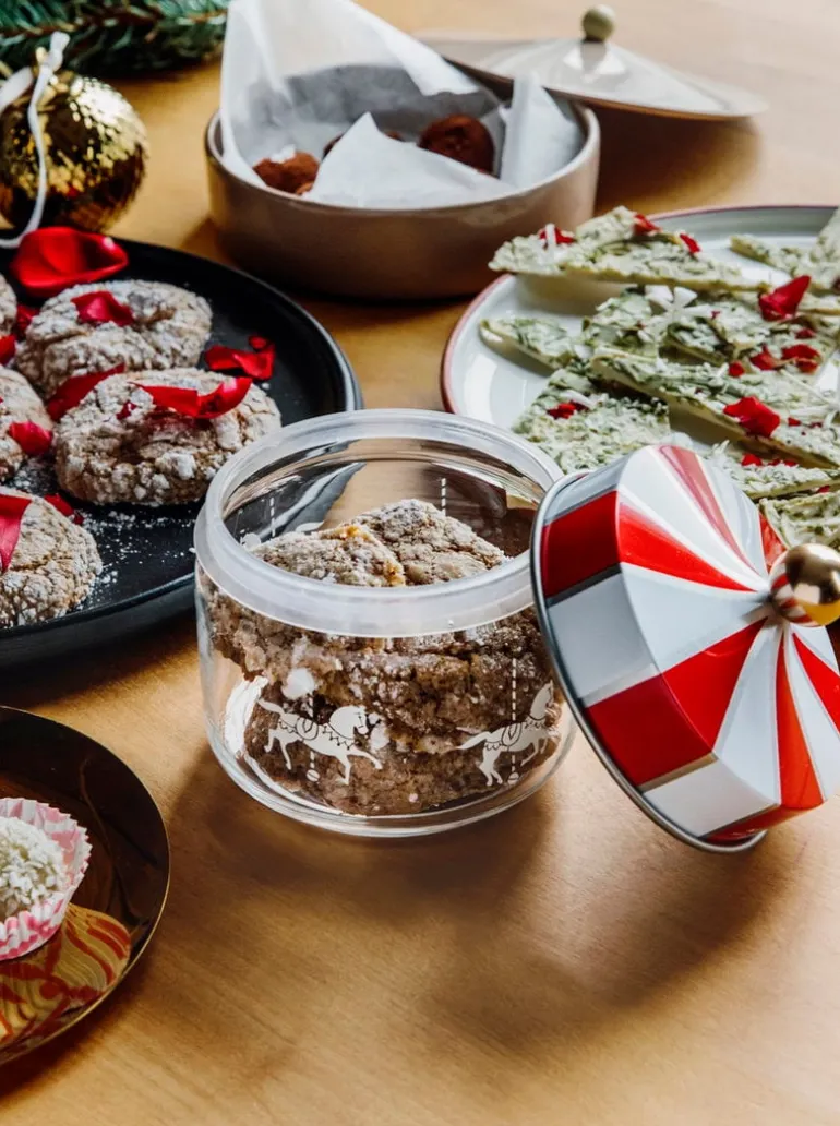 Alessis Circus-glasburkar pryds av vita karusellhästar. Det röda och vita locket i bleckplåt har en tätningsring och en guldknopp. Burkarna finns tillgängliga i olika storlekar.
