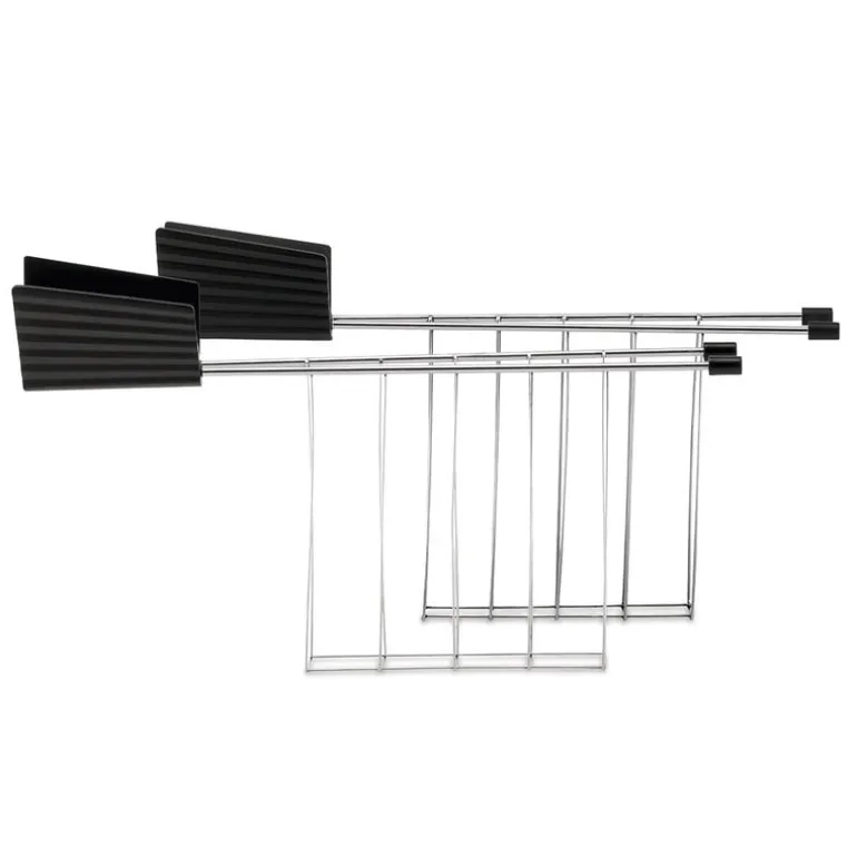 Brödroststället från Alessi gör det enklare att lyfta upp det rostade brödet ur Plissé brödrost. Handtagen på det rostfria stålstället är gjorda av termoplastisk harts med tygliknande veck som känns igen från resten av Plissé-kollektionen.