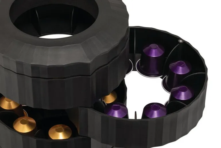 Kapsylhållaren Plissé är designad för att förvara espressokapslar och kaffekapslar och är en del av Alessis Plissé-kollektion, som hämtat inspiration från ganska oväntade håll: modevärlden och arkitekturen. Hållaren är tillverkad av återvunnen plast och den matta ytan på utsidan liknar strukturen på ett veckat tyg.