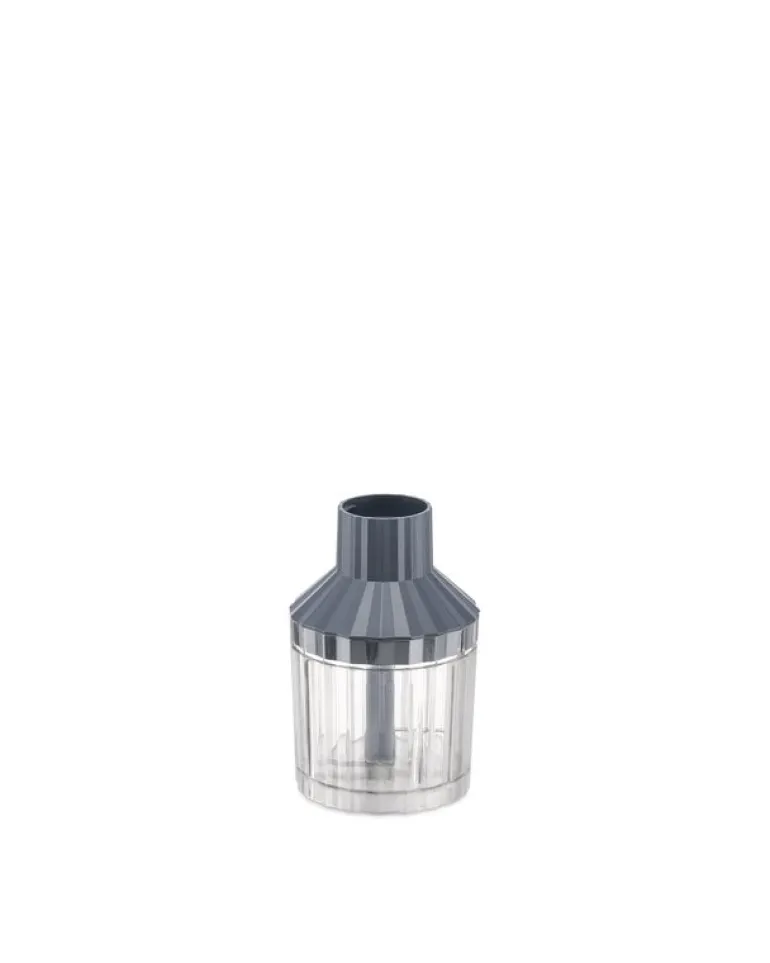 Setet innehåller även en stålvisp och en liten matberedare med separat behållare som rymmer 350 ml. Den halkfria basen ser till att behållaren står stadigt på plats under användning med stavmixern eller hackaren.