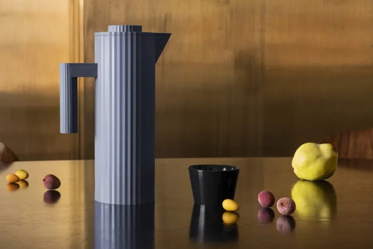 Termokannan Plissé från Alessi är inspirerad av mode- och arkitekturvärlden. Dess tredimensionella yta påminner om veckat tyg och har en dynamisk, skulptural silhuett. Designad av Michele De Lucchi, är Plissé termokannan väl lämpad för att servera kaffe, te samt kalla drycker, och dess dubbelväggiga termoglas inuti hjälper till att hålla dryckerna vid önskad temperatur längre.