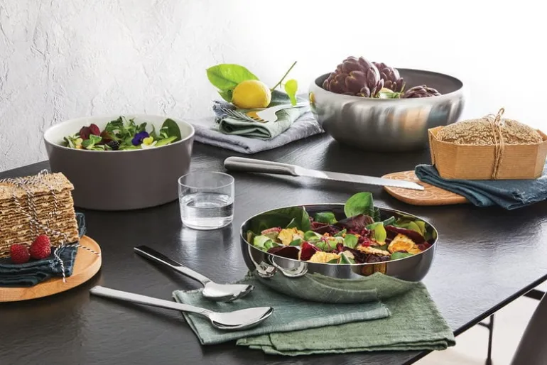 Alessis sallads- och serveringsskål, som skapats av den engelska formgivaren Jasper Morrison, är gjord av glänsande, elegant stål och är perfekt till servering av sallader, sidorätter och snacks. Skålen är tillverkad av spegelpolerat, rostfritt stål, och den tidlösa designen som återspeglar omgivningen går fint ihop med alla slags dukningar.