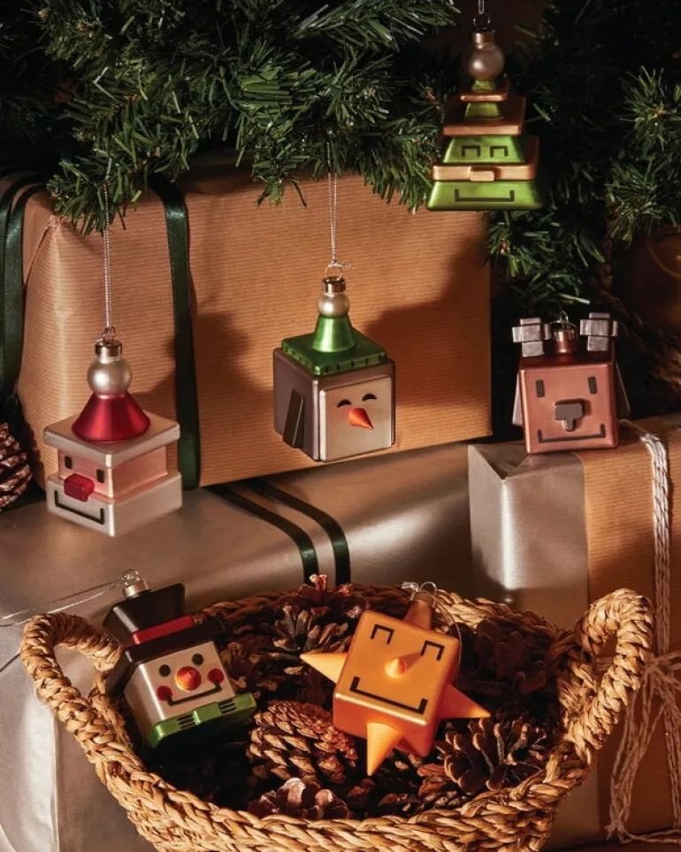Le Palle Quadrate-juldekorationerna från Alessi är en lekfull blandning av vintage-flair, gaminginspirerad stil och ett modernt designuttryck. De fyrkantiga kulorna är gjorda av glas och kan inte bara hängas på granen utan också på en dekorativ gren eller ett dörrhandtag. Snow Cube-kulan föreställer en glad snögubbe.