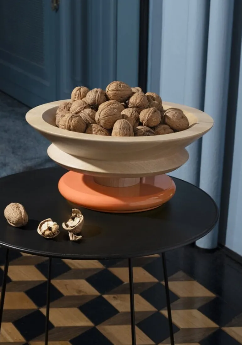 Alessis bordsuppsats Twergi ES15 är en uttrycksfull träskål utöver det vanliga som har skapats av den legendariska italienska designern Ettore Sottsass. Den stora bordsuppsatsen i lindträ är formad som en totempåle och består av en målad piedestal och en stor skål som kan användas för att servera frukt, godis eller olika prydnadssaker.