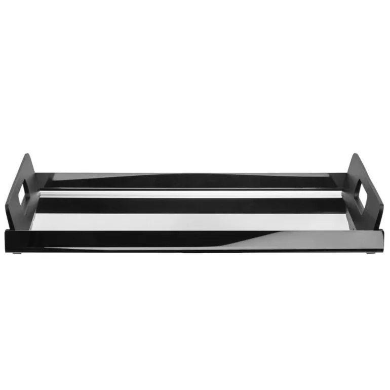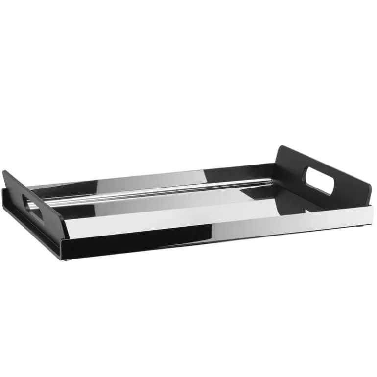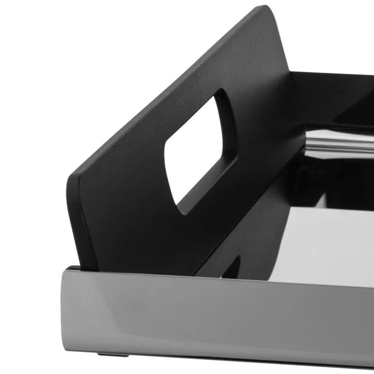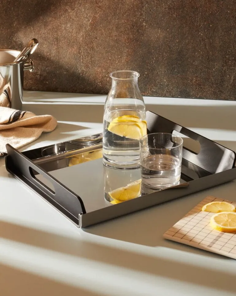 Alessis Vassily-bricka, som designats av Giulio Iacchetti, är en mångsidig serveringsbricka i polerat rostfritt stål med svarta plasthandtag. Den är rejäl och rymlig, och passar perfekt till att servera festliga drinkar till gästerna eller frukost på sängen. Dessutom är den eleganta designen en snygg detalj i köket.