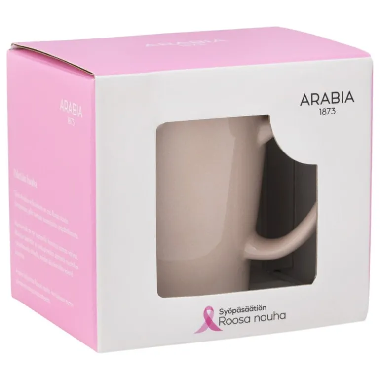 Muggen Mainio från Arabia har en mjuk, rosa färg. Den rosa keramikmuggen ingår i kollektionen Pink Ribbon, som stödjer bröstcancerforskningen i Finland. För varje såld produkt donerar Arabia en euro till den finska Pink Ribbon-kampanjen.