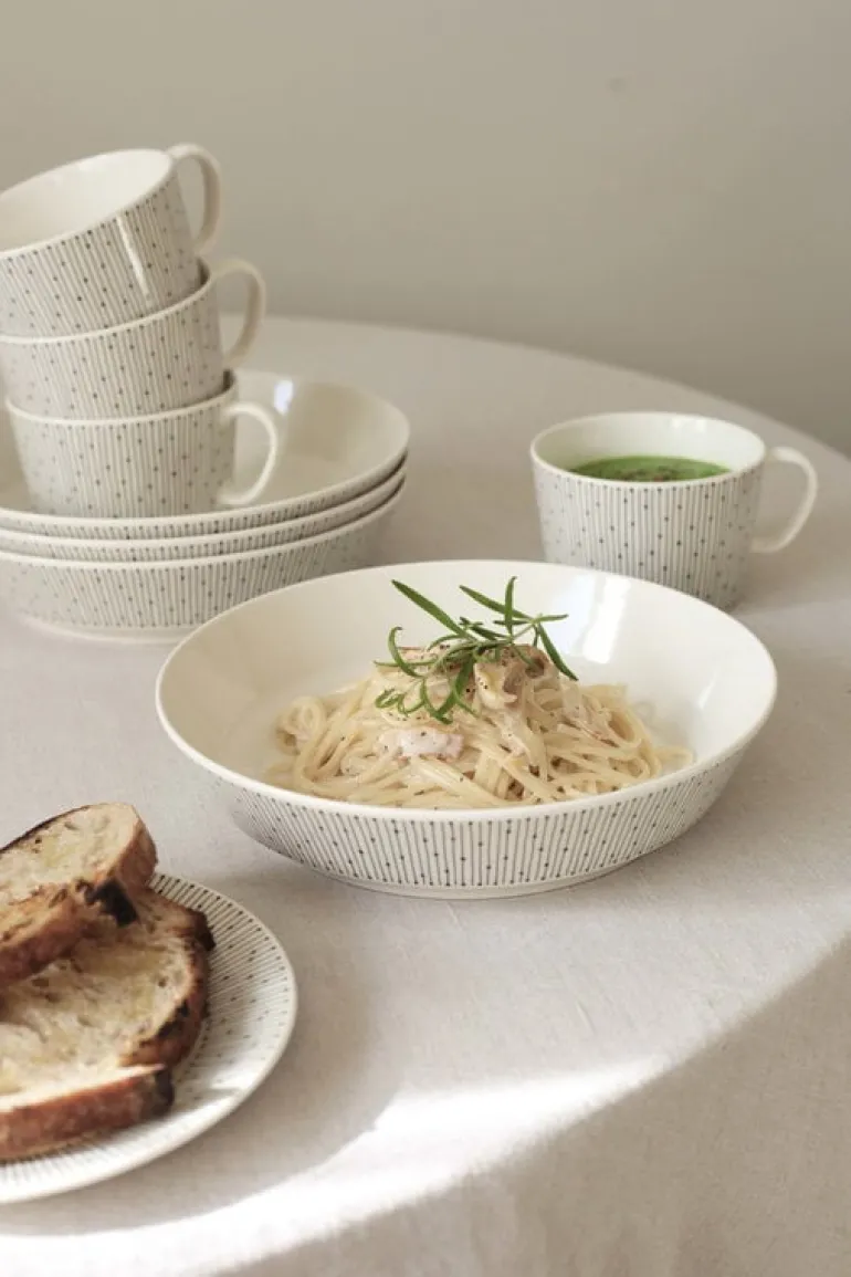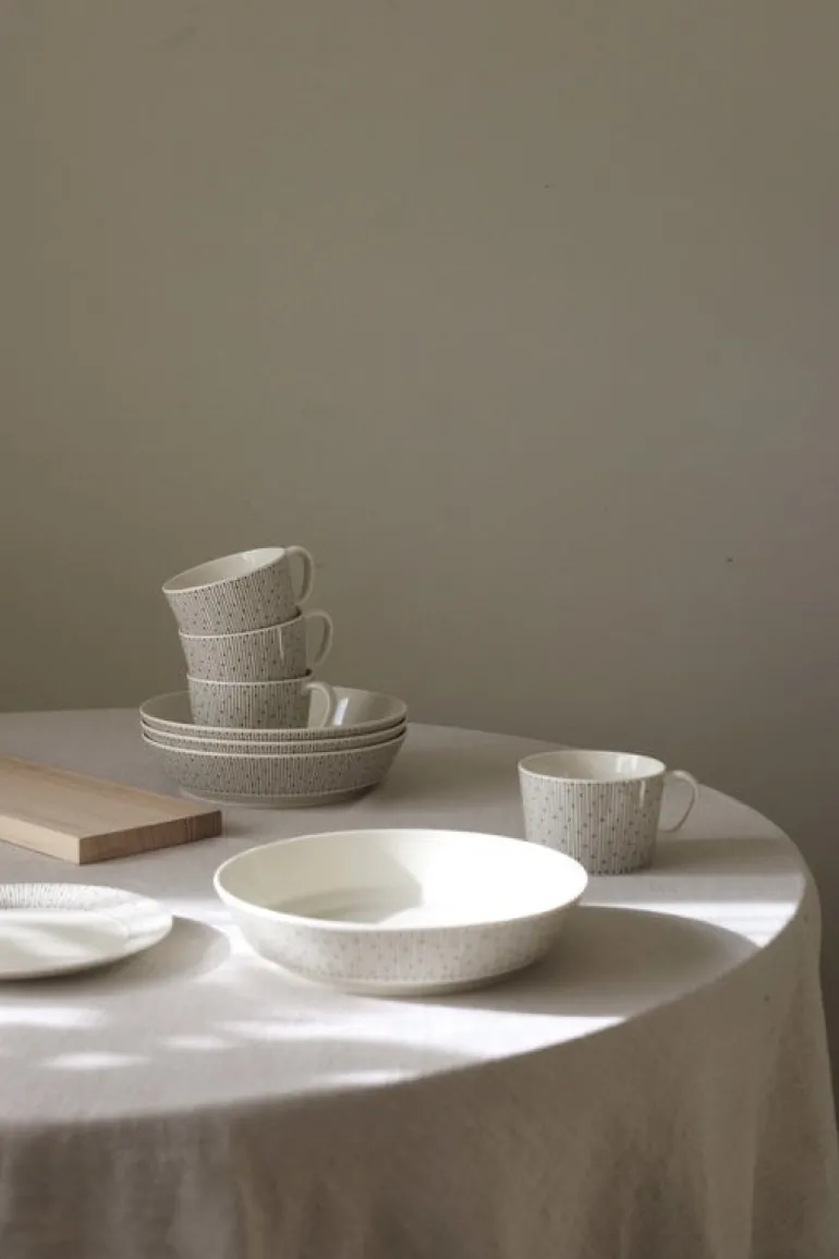 Mönstret Sarastus (”gryning”) symboliserar ljusets kraft och inspirerades av Raija Uosikkinens Ivalo-dekor från 1965, med de rytmiska linjerna som arrangeras i nya, fräscha former. Den lätta, stapelbara Mainio Sarastus-kollektionens muggar, skålar och tallrikar är diskmaskinssäkra, och tål ugnen såväl som frysen.