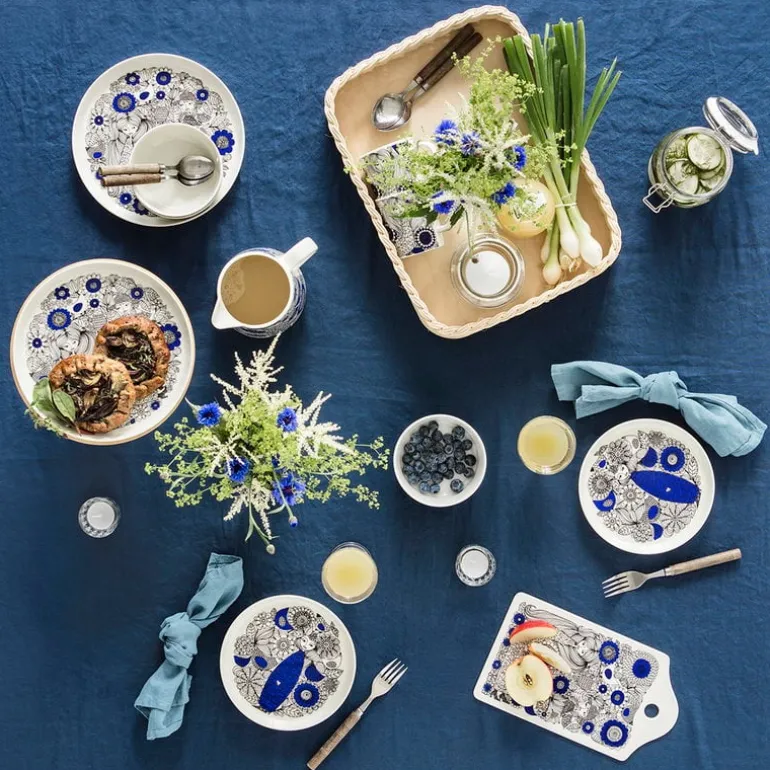 Arabias tallrik Pastoraali är smyckad med samma organiska mönster som Esteri Tomula formgav år 1965. Pastoraali, med motiv som visar människofigurer bland blommorna, bladen och fåglarna, har fått en djupt blå ton sedan den nya screentryckstekniken gjort det möjligt att använda klara färger. De myllrande, pastorala landskapsvyerna är tryckta på vitt, stilrent bordsporslin.