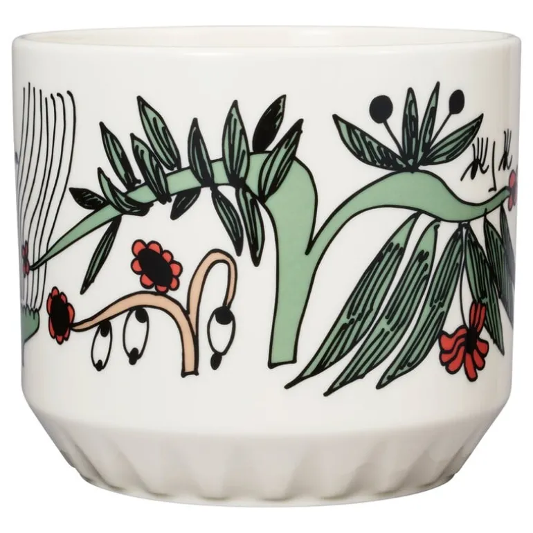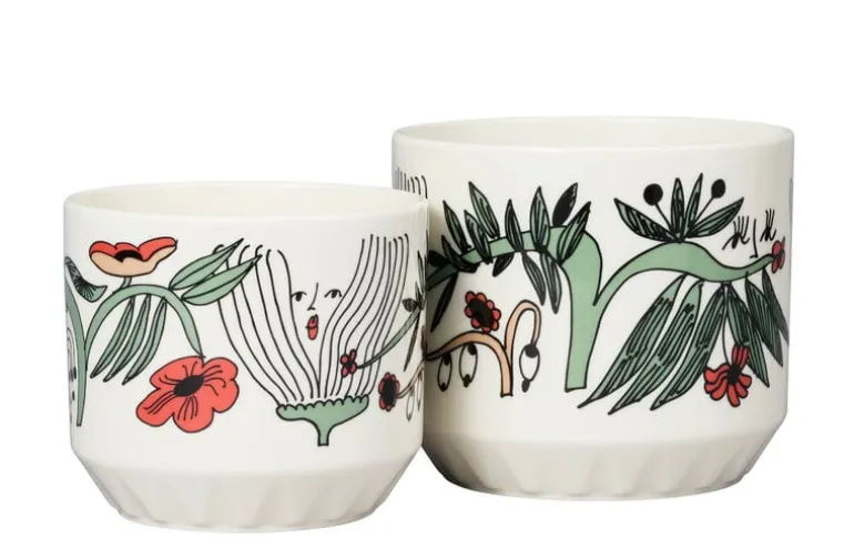 Arabias blomkruka Puutarhurit pryds av ett livfullt mönster skapat av Armi Teva 2023. Designen skildrar fantasifulla figurer som gömmer sig bland trädgårdsblommorna och bladen. Krukan är gjord av vitroporslin och mäter 14 cm i diameter. Det finns inget dräneringshål i botten av blomkrukan Puutarhurit, så vi rekommenderar att du använder lecakulor eller en plastkruka inuti.