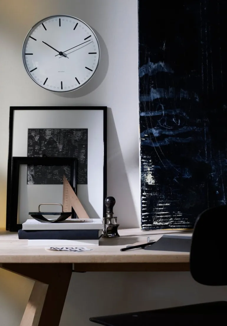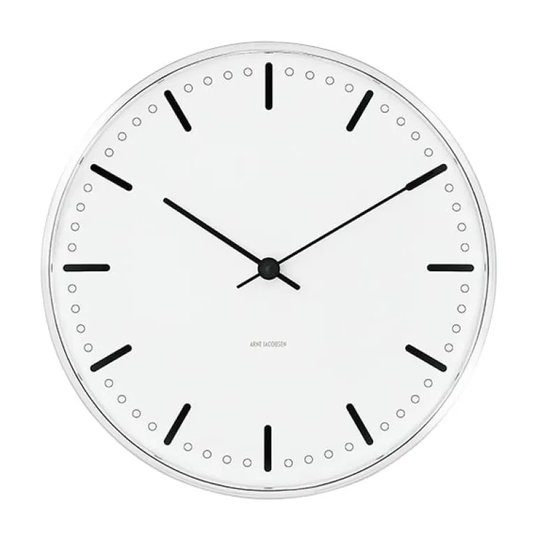 Väggklockan AJ City Hall av Arne Jacobsen är en reproduktion som är trogen den minimalistiska klockan som arkitekten designade till Rødovre rådhus 1956. Den eleganta klockans grafik är återhållen och aluminiumhöljet gör att klockan ger ett intryck av att sväva när den sitter monterad på väggen. Klockan AJ City Hall finns i tre storlekar.