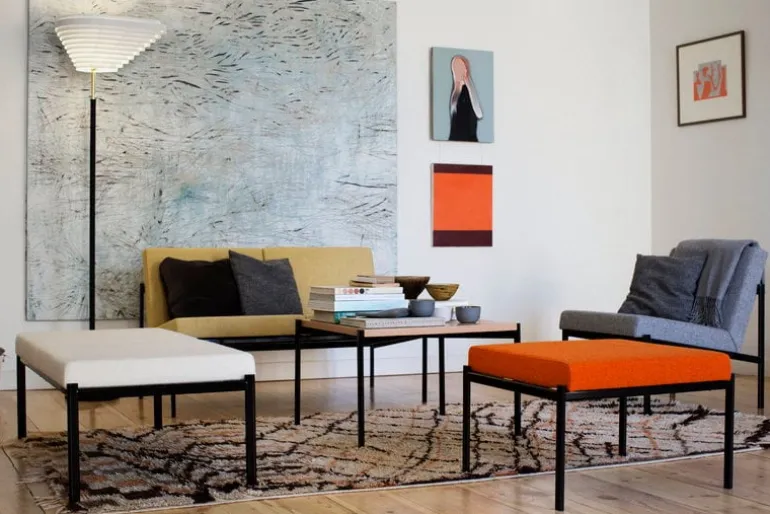 Arteks golvlampa A805 är även känd som “Angel Wing”, eller “Änglavinge”, då den skulpturliknande skärmen i flera lager är formad som en vinge. Angel Wing består av en välbalanserad kombination av olika färger och material: stativet är gjort av polerad mässing och svart läder, och lampskärmen av tunna, handnitade metallremsor. Alvar Aalto designade A805-lampan år 1954 för Folkpensionsanstalten i Helsingfors, och med sin tidlösa elegans kan den enkelt komplettera inredningen i moderna hem såväl som offentliga miljöer.
