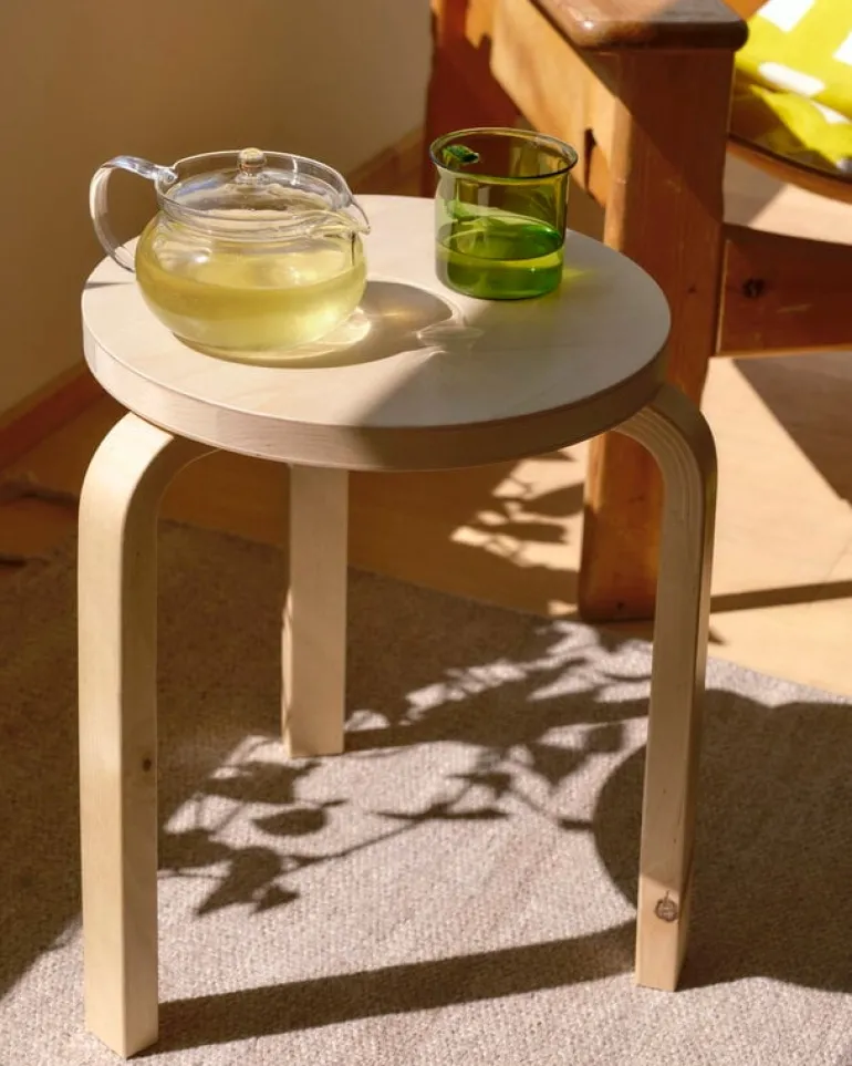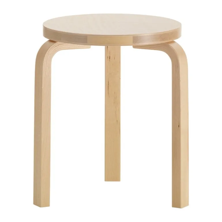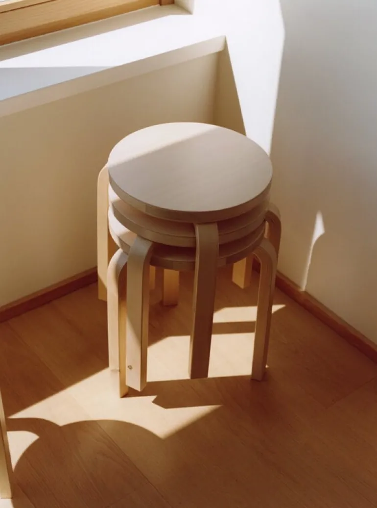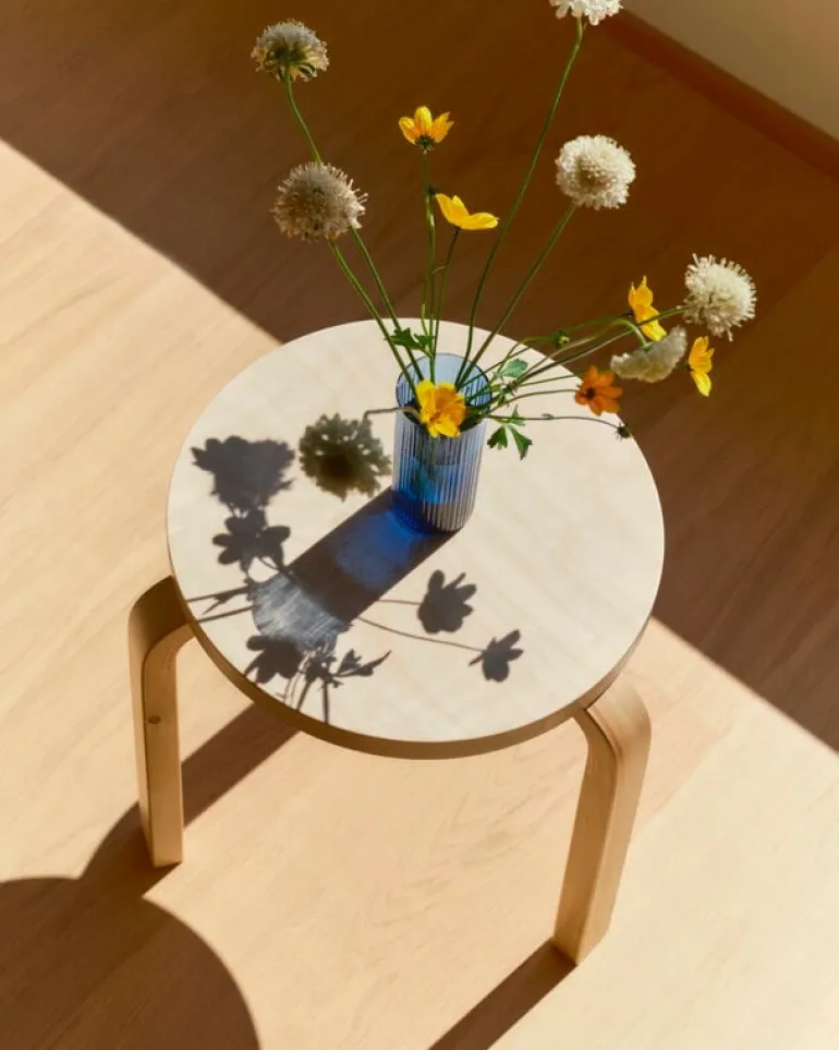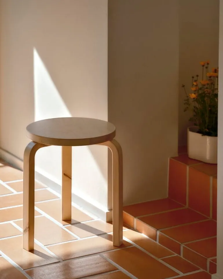 Arteks pall 60 hyllar björkträets autentiska skönhet: pallen är tillverkad av så kallad vildbjörk som visar materialets naturliga variation i sin helhet. Ytan kan ha synliga knutar, märken eller mörkare kärnved. I denna trebenta pall är både benen och sitsen tillverkade av vildbjörk. Pallen är tillverkad i Finland.